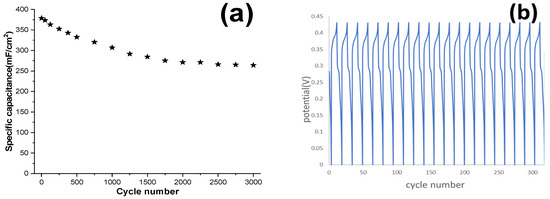 Long-term stability of NF electrodes, activated by FFT-CCV for 10,000 s, at a scan rate of 0.7 V/s, was evaluated through GCD cycling up to 3000 cycles at a current density of 20 mA/cm2 (Figure 10). The SC of the mixed α and β-Ni (OH)2 phases decreased from 378.6 to 268 mF/cm2, retaining approximately 70% of the initial capacitance after 3000 cycles at 25 mA/cm2 (Figure 10a). As shown in Figure 10b, the first 15 GCD cycles at 25 mA/cm2, further confirm the stability and reproducibility of the activated NF electrode. These results demonstrate that activation at 0.7 V/s facilitates a facile and effective method for preparing NF as a current collector in micro-supercapacitors.