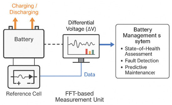 This section discusses the potential application of our system as a sensing device for SCs or batteries to monitor their SoH. While specific numerical data values may not be explicitly detailed here, relevant examples are provided in Figure 2 and Figure 3, which illustrate the electrochemical signals obtained through FFTCCV. The methodology demonstrated in this work for activating (NF) via FFTCCV not only enhances the electrochemical performance of MSCs but also establishes a framework for embedded health monitoring in energy-autonomous devices. here, FFTCCV enabled precise, real-time tracking of ΔQ, capacitance, and phase composition during activation and cycling. This high temporal resolution offers unique insights into kinetic phase transitions, morphology evolution, and asymmetries between anodic and cathodic processes that signify material degradation. Such diagnostic precision is critical when MSCs serve as functional components in microsystems, where consistent and predictable behavior directly impacts device reliability and importantly, the principles demonstrated here can extend beyond MSCs to larger-scale electrochemical systems, such as lithium-ion batteries. Similar time-resolved electrochemical signatures could reveal early indicators of electrode fatigue, electrolyte decomposition, or active material loss long before measurable capacity fade occurs. A practical architecture is schematized in Figure 12: a micro-scale reference cell (materials/electrolyte matched to the primary device) is perturbed at low amplitude; an FFT-based measurement unit extracts differential-voltage/ΔQ features and streams data to a battery management system (BMS) for SoH assessment, fault detection, and predictive maintenance. In MSC-based actuating systems, such an embedded sensor cell could report degradation in real time, enabling adaptive load management and fault prevention. In larger battery packs, BMS integration would allow continuous SoH tracking, early-fault detection, and predictive maintenance. Established techniques such as EIS provide effective baselines for detecting degradation and tracking aging-related parameters [51,52]. By linking advanced degradation simulations with time-resolved electrochemical data, it can enable early detection of battery degradation, ensuring optimal performance and longevity [53].