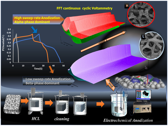 The NF was first cleaned and pretreated by sonicating in 2 M HCl solution for 10 min to remove surface impurities. Afterward, it was rinsed with deionized water and acetone, followed by immersion in 2M KOH to prepare it for activation. Solutions were prepared at 2 mol·L−1 (2 M), and for each step we used sufficient solution volume to fully submerge the NF, ensuring uniform exposure of all surfaces. The HCl sonication dissolves native NiO/Ni (OH)2 and removes adventitious contaminants; the deionized water and acetone rinses eliminate residual acid and organics; the subsequent KOH immersion neutralizes residual acidity and produces a hydroxylated, hydrophilic surface that improves wettability and promotes uniform electrochemical activation. The electrochemical activation and subsequent electrochemical tests were performed in a three-electrode system, with an Ag/AgCl as the reference electrode, a platinum wire as the counter electrode, and NF (0.35 cm × 0.35 cm, 1.5 mm thick) as the working electrode, in a 2M KOH solution as the electrolyte solution. FFTCCV was employed for activation of the pretreated-NF over a range of 5000 to 40,000 s in a potential window of 0–0.6 V at various sweep rates (0.007–1.4 V/s). FFT experimental data were acquired using a computer-controlled setup consisting of a data-acquisition board (PCL-818HG, Advantech Co., Taipei, Taiwan) and a custom-built potentiostat, as detailed in our previous works [40,41]. Data acquisition and processing were managed via dedicated software developed in the Delphi6® environment. In addition to activation, FFTCCV was also applied as a real-time diagnostic technique to monitor electrode behavior during extended cycling. By tracking differential charge exchange (ΔQ) and signal evolution in the frequency domain, FFTCCV could be used in the early identification of electrode fatigue. This functionality directly links to actuator performance, as it allows continuous evaluation of state-of-health and provides predictive insight into long-term reliability under repetitive actuation cycles.