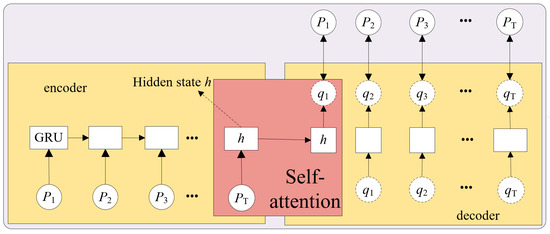 The Self-Attention Dynamic Gated Auto-Encoder (DGAE) is a deep-learning model that integrates self-attention with dynamic GRU, designed for processing time-series data and excelling in tasks such as fault diagnosis. Via an encoder–decoder architecture, GRU units capture long-term temporal dependencies, while the self-attention mechanism enhances the model’s focus on critical information. The overall structure is illustrated in Figure 2.
