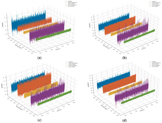 In real engineering, rotating machinery remains in a healthy state for most of its service life, so the available fault samples are not only scarce but also contaminated by environmental noise, exhibiting dual problems of “minority-class submergence” and “low signal-to-noise ratio”. To mitigate noise interference, Yang et al. [8] proposed an improved ensemble empirical mode decomposition (EEMD) method combined with an adaptive parameter adjustment mechanism to optimize noise amplitude and filtering thresholds; Sun et al. [9] suppressed wide-band noise while highlighting fault harmonics by modifying the intensity of the modulus maxima of wavelet transform coefficients; Zhang et al. [10] introduced a new lightweight convolutional neural network (CNN) framework for fault diagnosis that enlarges the receptive field of small convolutional kernels via dilated convolutions, demonstrating good anti-noise performance; Hao et al. [11] employed a doubly improved truncated singular value decomposition (DITSVD) technique for noise suppression and data augmentation; Liu et al. [12] combined complementary ensemble empirical mode decomposition with adaptive noise (CEEMDOAN) and signal-enhanced Hilbert transform (SEHT), using CEEMDOAN to decompose vibration signals of canned motor pumps for signal denoising; Lee et al. [13] proposed an unsupervised learning-based variational auto-encoder (VAE) and domain-adaptive neural network (DANN) for forklift acoustic data to examine fault prediction performance in noisy environments. However, the above works focus only on noise suppression and do not simultaneously solve the problem of minority-class omission caused by data imbalance.