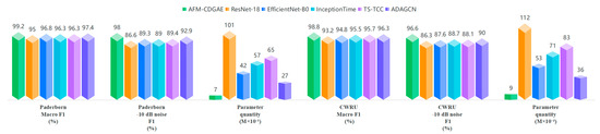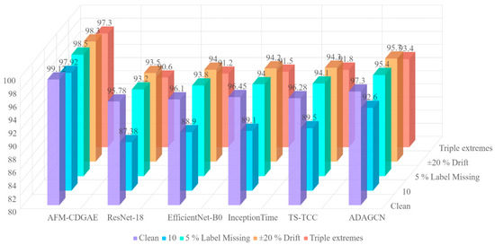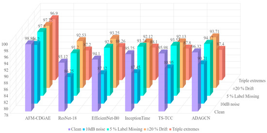 Systematic experiments on the Paderborn and CWRU datasets show that, under the quadruple extreme coupling of only 5% training labels, 10 dB strong noise, imbalance ratio 100:1 and plus or minus 20% speed or load drift, the proposed method still maintains Macro-F1 of 97.3% on Paderborn and 96.9% on CWRU (drops of only 1.8% and 1.5%), whereas the five latest baselines drop by an average of 6.7%. Compared with baselines, the overall improvement is 3.1% under normal conditions and 5.4% under extreme conditions. The model has merely 0.87 M parameters and 2.1 ms inference latency (RTX3070, Nvidia, in Santa Clara, CA, USA), and 7.3 ms after INT8 quantization on Jetson Xavier NX, meeting the requirements of real-time edge monitoring. Additional performance tests on three mainstream edge devices confirm broad deployment adaptability: Raspberry Pi 4B (4 GB RAM, Cortex-A72, ARM Holdings, in Cambridge, UK): INT8 latency amounts to 28.5 ms, peak CPU utilization reaches 65%, and power consumption stands at 4.2 W; NVIDIA Jetson Nano (4 GB RAM, Maxwell GPU, Nvidia, in Santa Clara, CA, USA): INT8 latency comes to 12.3 ms, peak CPU utilization tops out at 52%, and power consumption equals 7.1 W; Rockchip RK3588 (8 GB RAM, Cortex-A76, ARM Holdings, in Cambridge, UK): INT8 latency measures 9.7 ms, peak CPU utilization peaks at 48%, and power consumption totals 8.3 W. All devices meet real-time requirements (latency less than 30 ms) for rotating machinery monitoring (typical sampling frequency: 1 to 2 kHz). Comparative experiments and step-wise ablation further confirm that BST-WVI boosts Macro-F1 from 91.3% (baseline) to 98.6% and recall by 8%, serving as the decisive module to break the ceiling in imbalanced scenarios, fully validating the robustness and generality of AFM-CDGAE.