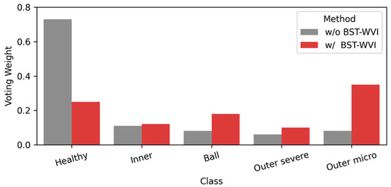 - A reconstruction–classification joint loss and BST-WVI ensemble strategy are proposed. Balanced subsets are constructed by permutation sampling, and weights are recalibrated via minority-class F1-weighted voting, improving Macro-F1 on Paderborn and CWRU by 7.7% and 9.5%, respectively, under a 1:100 extreme imbalance and restoring recall to 99% and 98%, breaking the systematic majority-class bias of traditional majority voting.