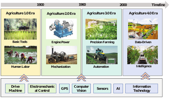 Agriculture plays a fundamental role in global food supply, economic stability, and sustainable development. However, it is projected that the world’s population will reach 10 billion by 2050, necessitating a substantial increase in agricultural productivity to meet rising food demands [1]. Throughout history, advancements in agricultural productivity have primarily resulted from structural changes and have undergone four major transformations to date. The technological features characterizing each stage of agricultural development are illustrated in Figure 1. Among these, traditional cultivation methods from ancient times to the late 19th century are commonly classified as Agriculture 1.0. During this period, agriculture relied heavily on localized tools and intensive manual labor, resulting in a characteristically labor-intensive production model. Although this method has low production efficiency, a standardized workflow for agricultural operations has been established, thereby providing a logical foundation for subsequent operations involving agricultural robots.