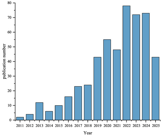 In this study, the literature was primarily retrieved from ScienceDirect, IEEE Xplore, and Web of Science. The search keywords included “agricultural automatic driving,” “agricultural unmanned vehicle,” “agricultural UAV,” “agricultural robot,” “orchard robot,” “livestock and poultry breeding robot,” “agricultural machinery positioning,” “agricultural machinery perception,” “agricultural machinery control,” and “agricultural actuator.” Inclusion criteria were established to encompass peer-reviewed journal articles, conference proceedings, and relevant book chapters published between 1 January 2011 and 30 May 2025. A small number of publications released before 2011 were also included to provide background information or clarify specific technical concepts. Duplicate entries retrieved from multiple databases were removed. By reading the titles and abstracts of the retrieved articles, relevant papers that match the research scope were sorted out, totaling 506 documents. Each document was exported in TXT format and converted into structured full-text records. A synonym substitution file along with the literature dataset was imported into VOSviewer 1.6.20 for bibliometric analysis, and the resulting keyword co-occurrence visualizations were generated. To more intuitively illustrate the temporal and geographic distribution of research on autonomous driving agricultural machinery, the relevant data from VOSviewer were subsequently imported into Origin 2025 and Scimago Graphics 1.0.51 for visualization.