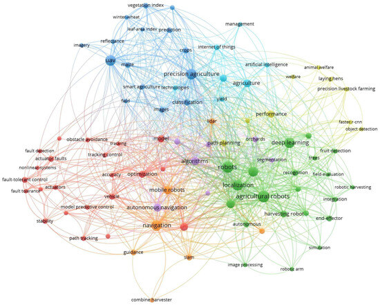 Figure 4 shows the keyword co-occurrence network in all studies. VOSviewer software is employed to conduct a comprehensive analysis of keywords extracted from 506 selected papers. To reduce redundancy, some keywords with similar meanings are consolidated, such as “robotics” and “robots”, “smart farming” and “smart agriculture”, and “unmanned aerial vehicle” and “uav”. The keyword frequency threshold is set to 5, and generic terms such as “design” and “system” are excluded, resulting in a final set of 88 relevant keywords. In the visualization, the size of each circle represents keyword frequency, with larger circles indicating higher frequencies. Different colors denote distinct clusters, and arcs between circles indicate co-occurrence relationships. The frequent appearance of terms such as “robots”, “machine vision”, “navigation”, and “deep learning” indicates a diversification of autonomous driving agricultural machinery functions and a continuous enhancement in both navigation performance and intelligence level.