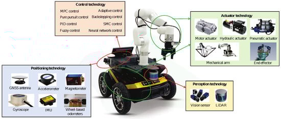 The automatic driving of agricultural machinery is a complex form of systematic engineering, which consists of four key technologies: positioning, perception, control, and actuators, as shown in Figure 5. These technologies cooperate with each other and operate collaboratively to ensure the automatic driving and autonomous operation of agricultural machinery and equipment. Specifically, we summarize the key technologies as follows: (1) positioning technology is the cornerstone of agricultural machinery autonomous driving, providing accurate position, speed, and time information for agricultural machinery; (2) perception technology endows agricultural machinery with “vision” and “touch” to help it capture the surrounding environmental information and the information of the target operation object; (3) motion planning and control technology act as the “brain” of agricultural machinery autonomous driving, responsible for planning motion paths and formulating control strategies; (4) as the “muscle” of agricultural machinery, the actuator technology is responsible for driving the movement of mechanical equipment and completing specific operational tasks.