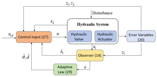 To address sensor noise and unmeasurable system states, numerous observer-based control strategies have been proposed for electro-hydraulic servo systems [24,25,26,27,28]. Reference [29] presents a novel control strategy that estimates actuator chamber pressures from work port pressures using differential equations, eliminating the need for direct pressure or position sensors. The controller dynamically adjusts gains through fuzzy logic-based gain scheduling, enhancing adaptability across a wide range of operating conditions. Reference [30] proposes an active disturbance rejection control method for electro-hydraulic servo systems, which employs a disturbance observer based on an extended state observer (ESO). Here, the ESO estimates the system’s unknown states and disturbances, while the disturbance observer reconstructs the system’s mismatched disturbances. Reference [31] puts forward two motion control strategies for electro-hydraulic servo systems using linear extended state observers (LESOs). These observers are specifically designed to compensate for system uncertainties, thereby effectively enhancing system robustness. To reduce the impact of measurement noise on velocity signals, Reference [31] also uses an LESO to reconstruct actuator velocity, and adopts a parameter adaptive mechanism to mitigate the influence of parameter uncertainties on system performance. Theoretical analysis shows that this control method can guarantee transient performance and predefined final tracking accuracy even in the presence of time-varying uncertainties. Notably, the ESOs used in References [30,31] are linear in structure. While they offer advantages such as simple architecture and convenient parameter tuning, they are highly sensitive to measurement noise. Designers must therefore make a trade-off between the observer’s estimation accuracy and its ability to suppress measurement noise. Thus, how to design a robust control strategy for electro-hydraulic servo pressure control systems that simultaneously accounts for measurement noise, time-varying parameter uncertainties, and external disturbances remains a highly challenging task.