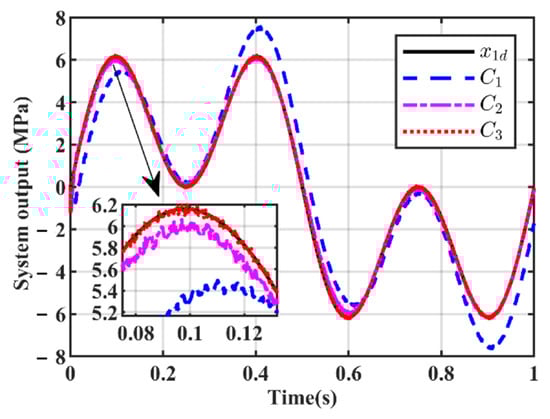 C1: A PI controller with feedforward, which is commonly used in engineering practice. Controller parameters are tuned via the trial-and-error method until the system’s output pressure tracks the given command signal with maximum accuracy. Specifically, the feedforward gain is set to 0.02, the proportional gain to 0.5, and the integral gain to 0.2.