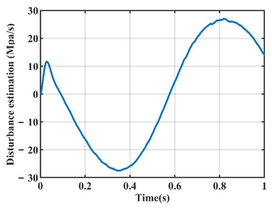 Case 1: First a low frequency command was employed to test the control accuracy of the proposed controller. The command signal is set to MPa, and the corresponding simulation results are presented in Figure 3, Figure 4, Figure 5, Figure 6, Figure 7 and Figure 8. Figure 3 shows the system output responses under the three controllers. The tracking errors of the three controllers are depicted in Figure 4. The specific performance indicators of the tracking errors are listed in Table 2. As observed from Figure 4 and Table 2, it can be seen that, when tracking the low-frequency command signal, the control accuracy of the traditional PI controller C1 and the model-based controller without adaptive mechanism C2 is relatively close. This is primarily attributed to the integral term in the PI controller, which eliminates steady-state errors. In contrast, the proposed output feedback adaptive controller C3 achieves higher tracking accuracy than C2 among model-based controllers—fully demonstrating the effectiveness of the parameter adaptive mechanism designed in this paper. The observer’s estimation of the system output signal is illustrated in Figure 5. At low frequencies, the constructed observer can accurately reconstruct the actual system output, verifying its reliability for state estimation. Figure 6 presents the output of the perturbation estimator. It can be seen that the perturbation estimation remains bounded throughout the simulation, which is consistent with the theoretical analysis. Figure 7 shows the variation trend of adaptive parameters. After a short transient period, all adaptive parameters converge to their steady-state values, indicating the stability of the adaptive mechanism. The control input of the proposed C3 controller is shown in Figure 8. The control input is continuous and bounded, which satisfies the practical operation requirements of engineering applications.