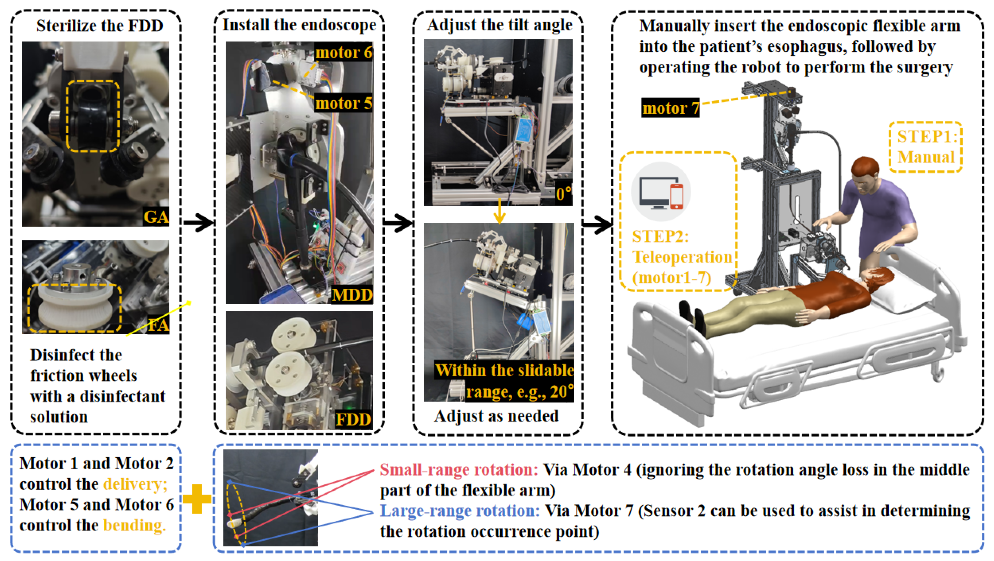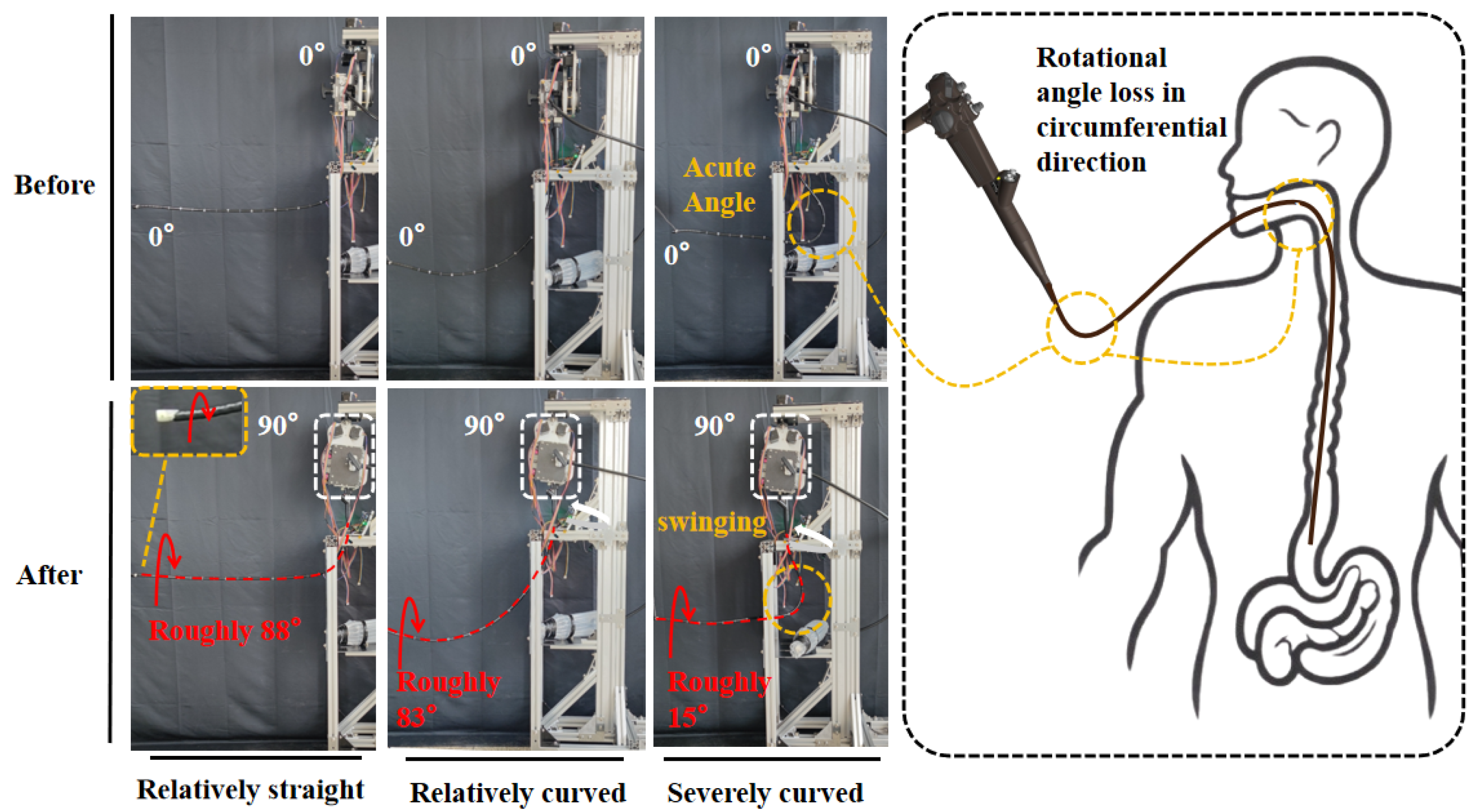 - Basha, S.; Khorasani, M.; Abdurahiman, N.; Padhan, J.; Baez, V.; Al-Ansari, A.; Tsiamyrtzis, P.; Becker, A.T.; Navkar, N.V. A generic scope actuation system for flexible endoscopes. Surg. Endosc. 2024, 38, 1096–1105. [Google Scholar] [CrossRef] [PubMed]