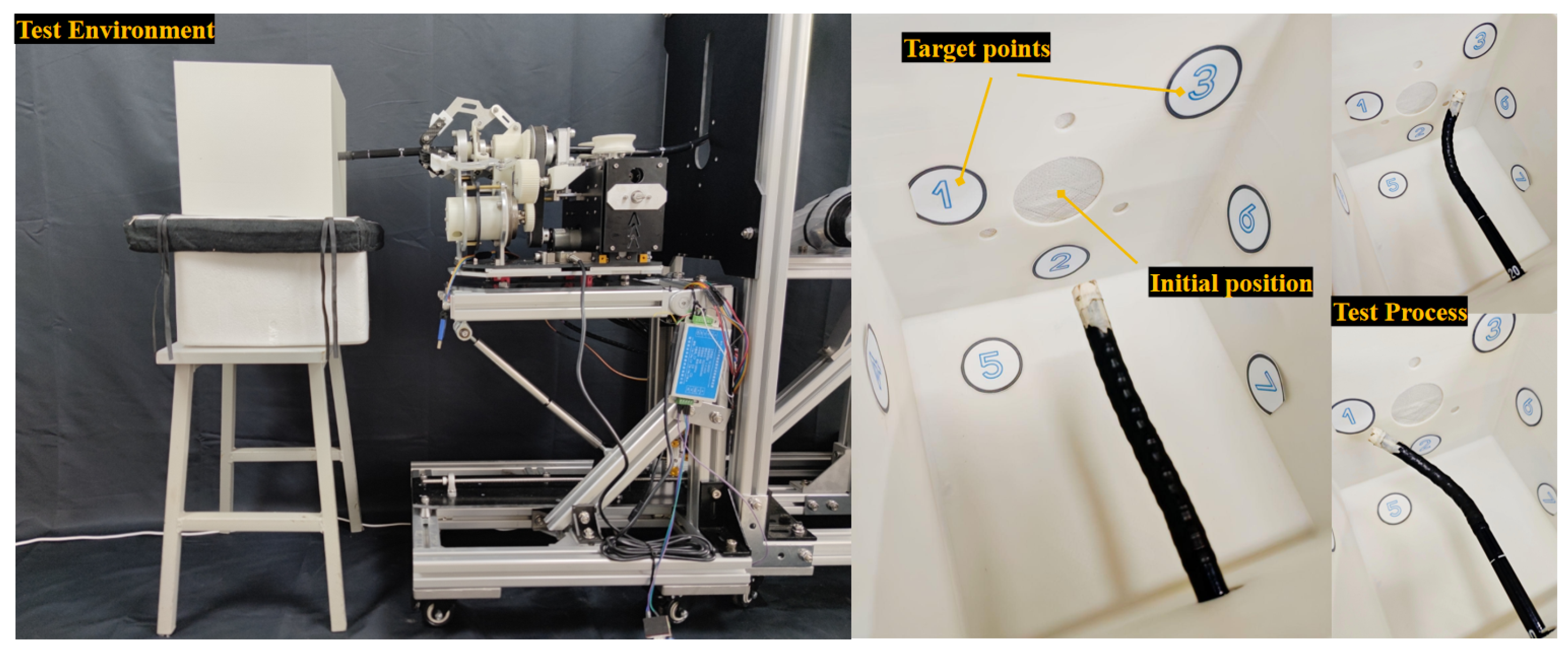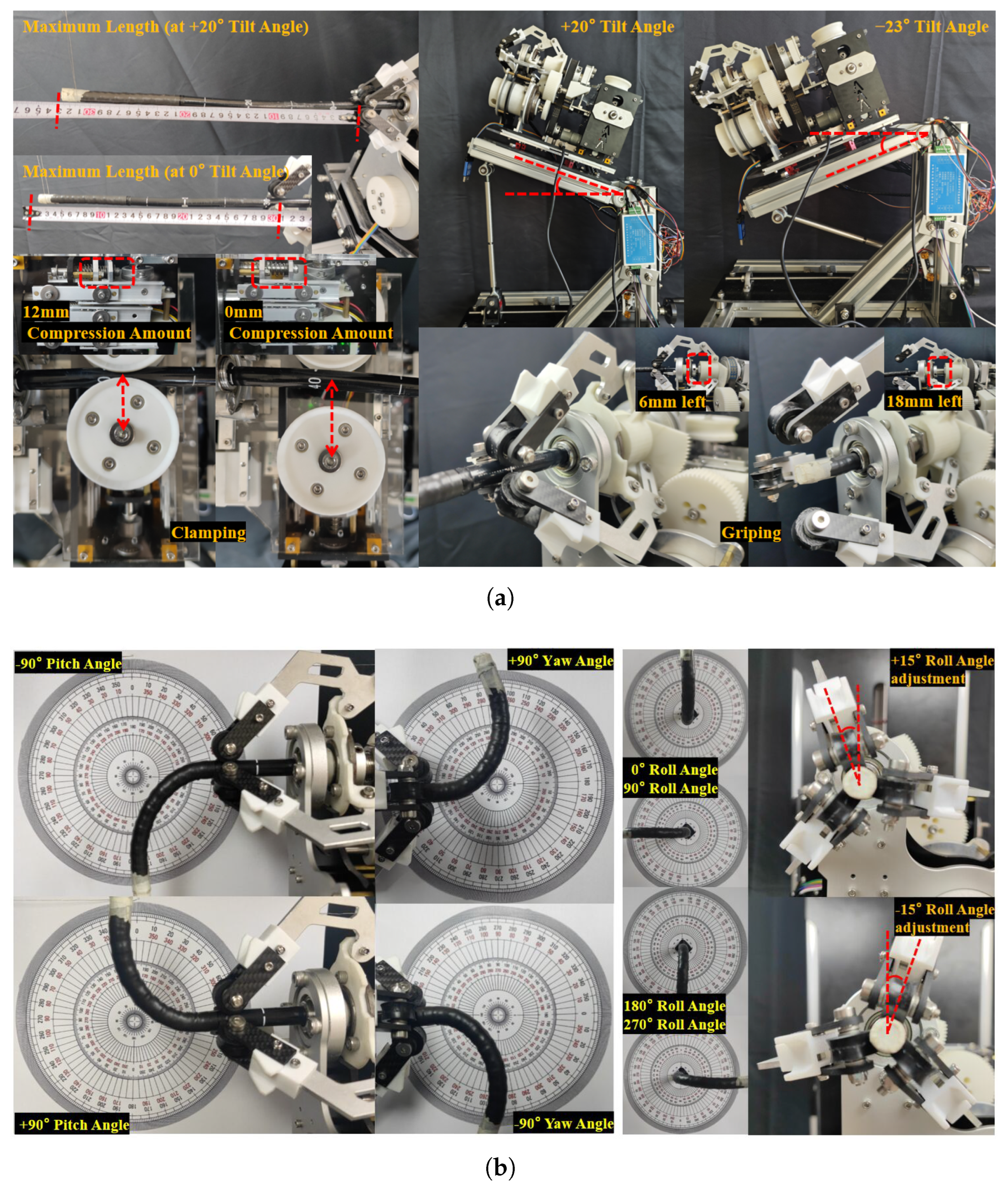 - Liu, M. Research on the Design and Sensing Method of a Dexterous Mechanism for Digestive Endoscopic Robots. Master’s Thesis, Shenyang Ligong University, Shenyang, China, 2023. [Google Scholar]