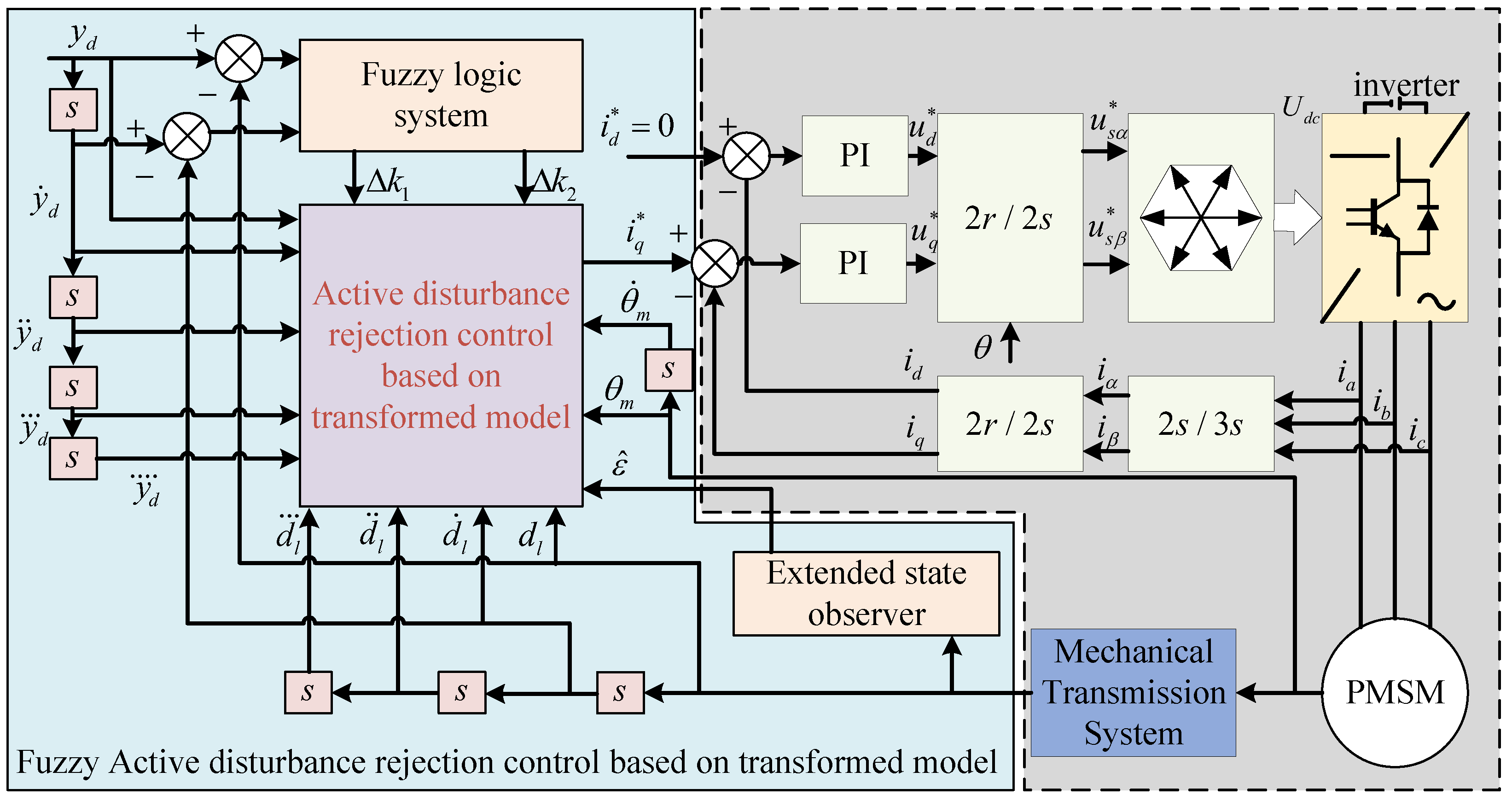 - In the outer loop, an active disturbance rejection control (ADRC) strategy is proposed based on feedback linearization, where the desired command current input is calculated using the state feedback of a PMSM and the estimation of disturbance from an ESO, with control law gains adaptively optimized via a fuzzy logic inference mechanism.