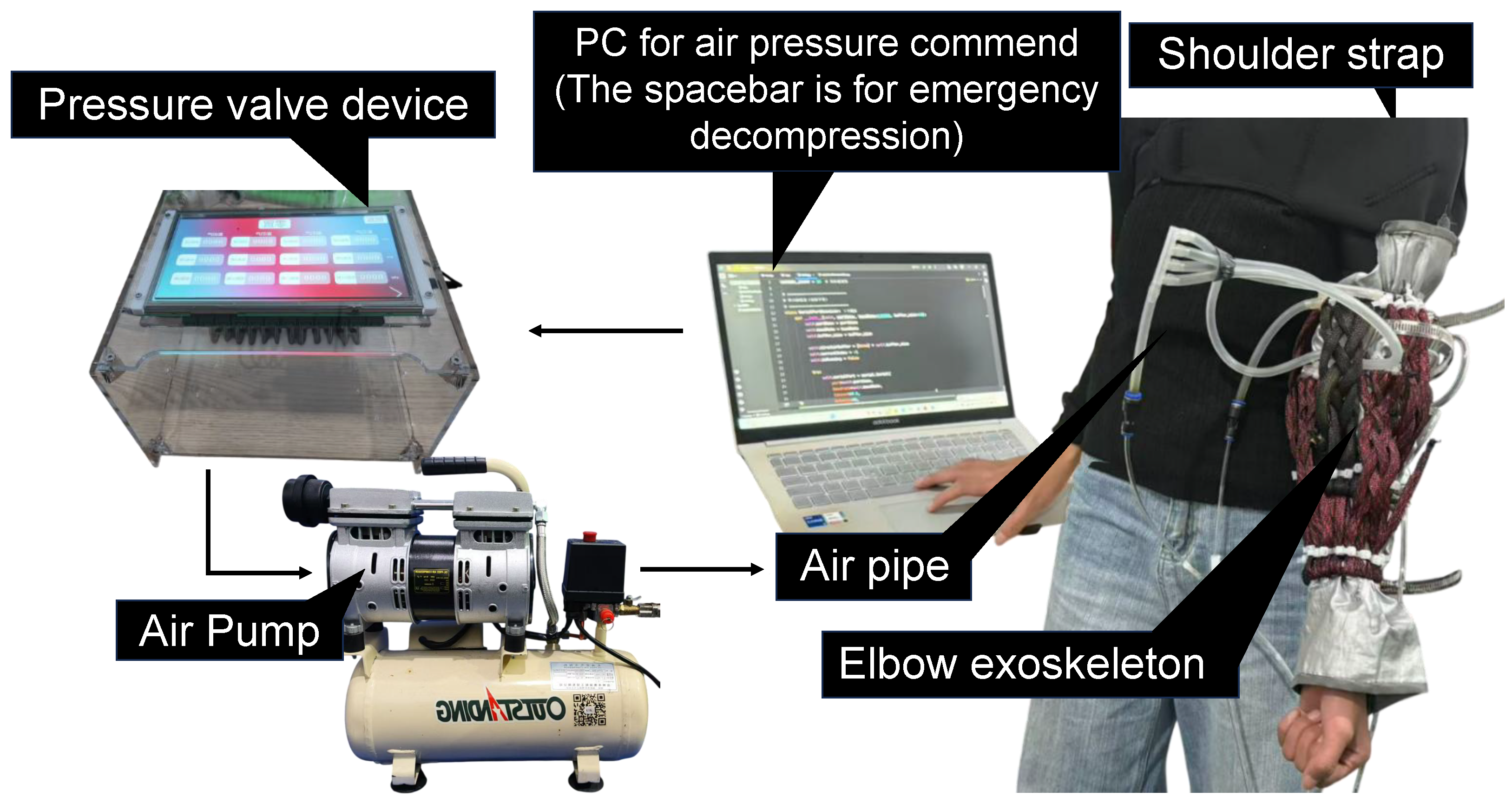 - Peng, Y.; Sakai, Y.; Nakagawa, K.; Funabora, Y.; Aoyama, T.; Yokoe, K.; Doki, S. Funabot-Suit: A bio-inspired and McKibben muscle-actuated suit for natural kinesthetic perception. Biomim. Intell. Robot. 2023, 3, 100127. [Google Scholar] [CrossRef]