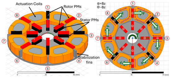 - Finally, a set of eight actuation coils are placed in each stator part with an angular phase of 45/2 degrees with respect to the PMs in the stator. They are used to overcome the potential energy well and switch from one stable position to another. Forces and momentum generated by the actuation coils are illustrated in Figure 1.