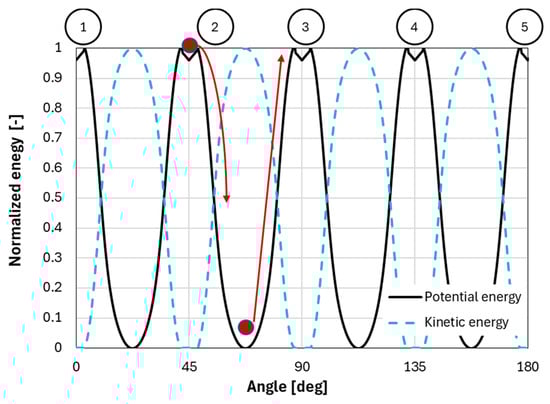 Normalized kinetic and potential energy of the rotor vs. its angular position.