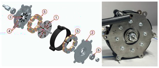 (Left): Detailed design of the potential actuator. 1. Rotor, 2. Stator yoke, 3. PMs, 4. Stabilization fins, 5. Coils, 6. Bearing. (Right): Actuator assembled.