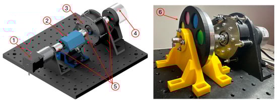 (Left): CAD representation of the testbench for quasi-static characterization tests. (Right): Picture of the testbench for dynamic testing with payload. 1. Stepper motor, 2. Torque sensor, 3. Actuator, 4. Encoder, 5. Elastic couplings, 6. Payload.