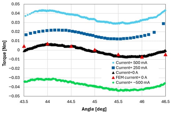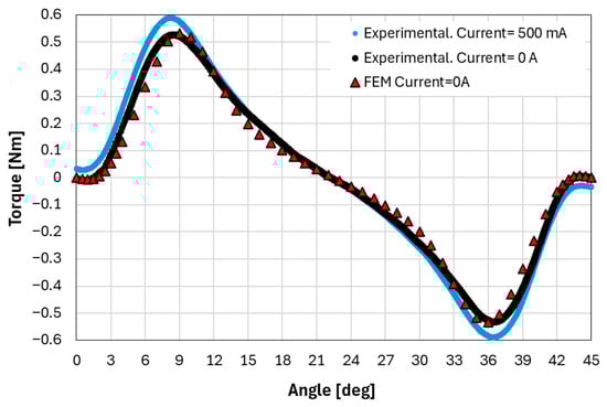 Figure 7 shows the rotor torque vs. angle measured in quasi-static conditions from 0 to 45 degrees (separation between stable positions) for an actuation current of 0 A and 500 mA and compared with the results of the FEM model [19] for an excitation current I = 0 A. A good agreement is observed between experimental and FEM results.