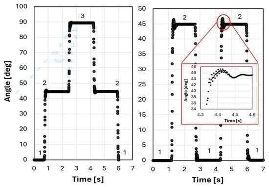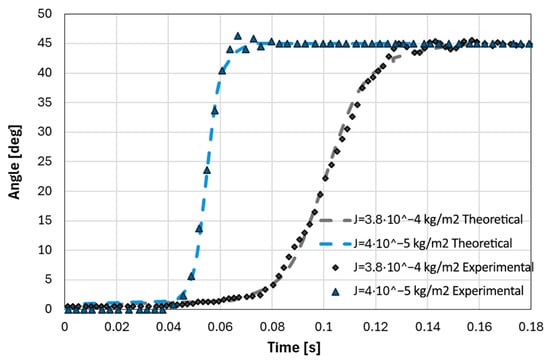 From data in Figure 9, a maximum angular speed of 663 rpm and angular acceleration of 14,500 rad/s2 for the actuator with , and 216 rpm and 1540 rad/s2 for the actuator with the payload () are calculated. The time required for a position time change is determined in t = 48 ms for and t = 140 ms for As the inertia of the system increases, the angular acceleration and speed are reduced and the time required for a position change increases consequently.