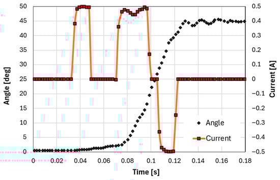 A set of spikes and oscillations in the rotor’s angular position can be observed in the vicinity of the equilibrium positions in Figure 9, Figure 10 and Figure 11. These oscillations are underdamper harmonic vibrations of the rotor around the stable equilibrium positions of the actuator.
