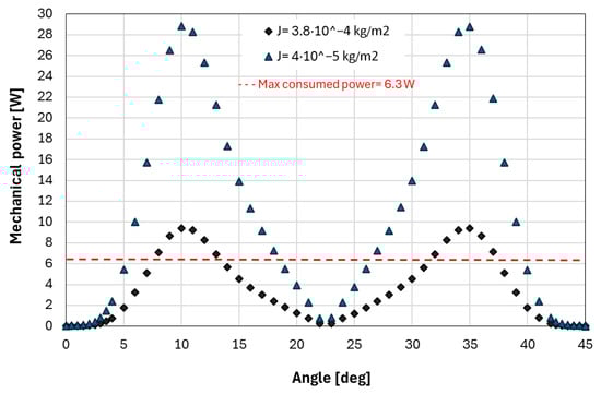 Figure 13 shows the equivalent actuator mechanical power vs. the angular position of the rotor and the experimental maximum power consumption of the potential actuator. From results in Figure 13 and Table 3, the power saving ratio is calculated as: