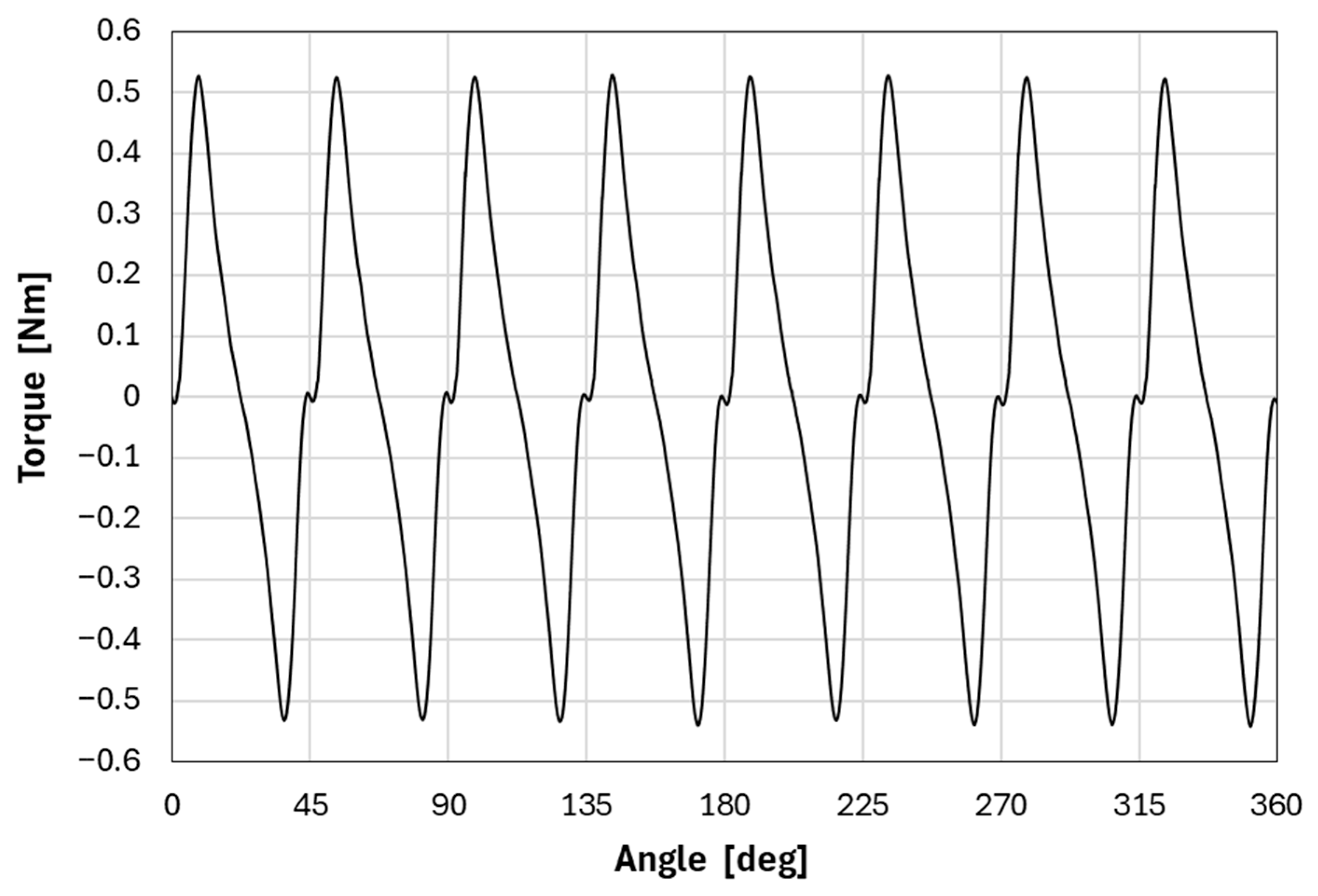 Figure 6 shows the torque vs. angular position of the rotor when no current flows through the coils. Eight positions of stable equilibrium can be observed at