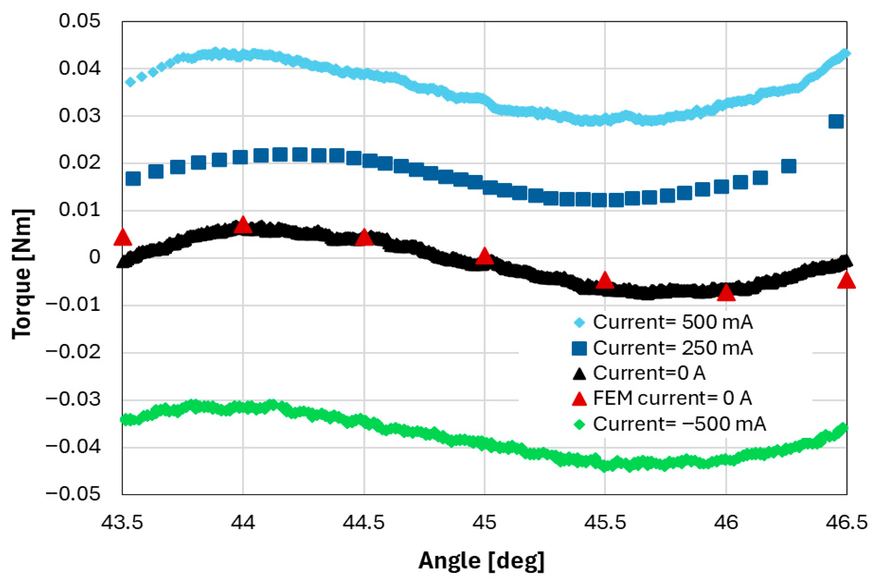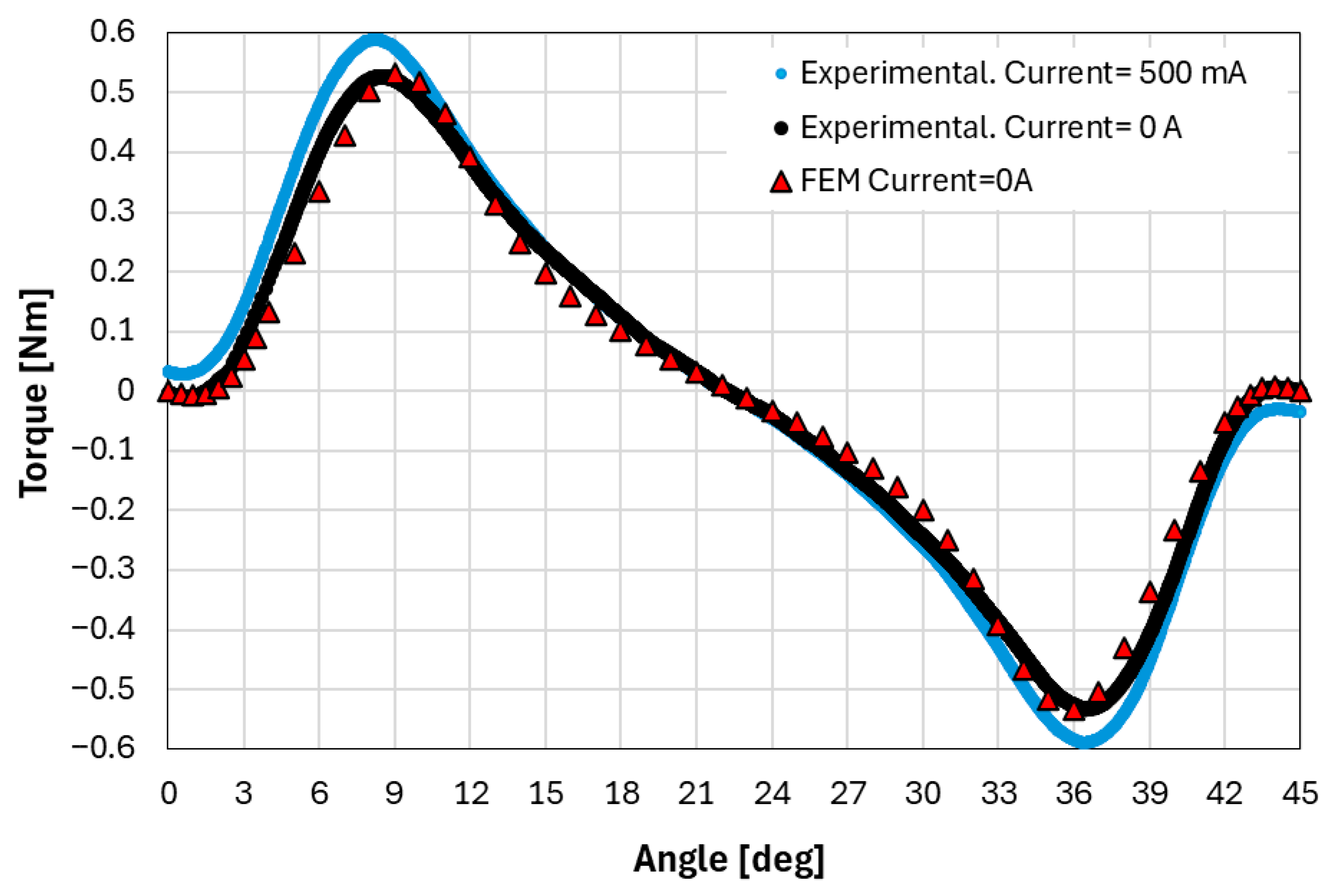 Figure 7 shows the rotor torque vs. angle measured in quasi-static conditions from 0 to 45 degrees (separation between stable positions) for an actuation current of 0 A and 500 mA and compared with the results of the FEM model [