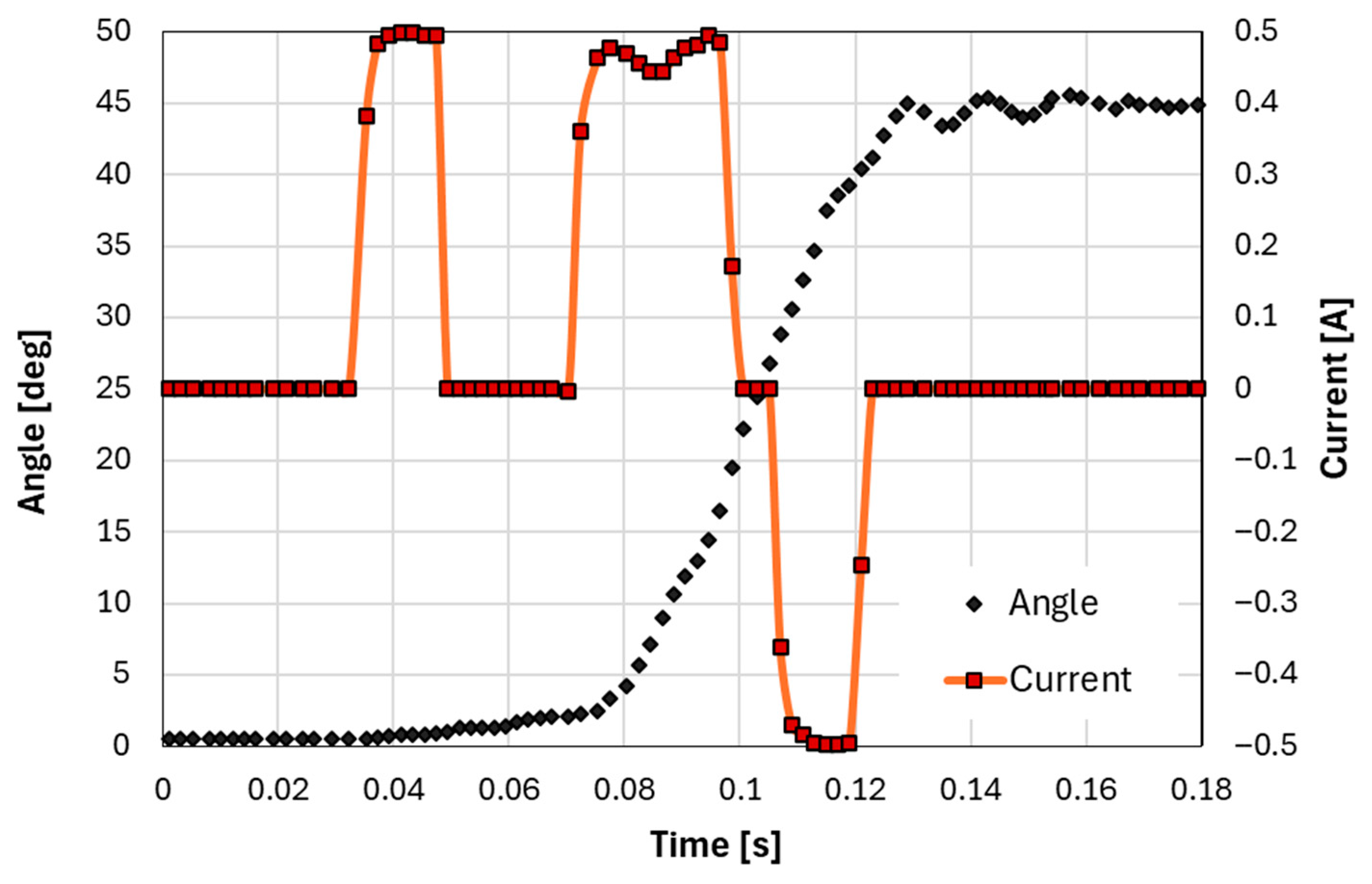). Once the setup is ready, the actuator is excited by an input voltage of about ±12.7 V. This excitation voltage generates a maximum current amplitude of about ±500 mA, which was the minimal excitation current experimentally determined for a repeatable and successful operation of the actuator. The current in the coils was close-loop controlled by measuring the rotor angular position and based on a programmed command that minimizes energy consumption, as will be explained later.