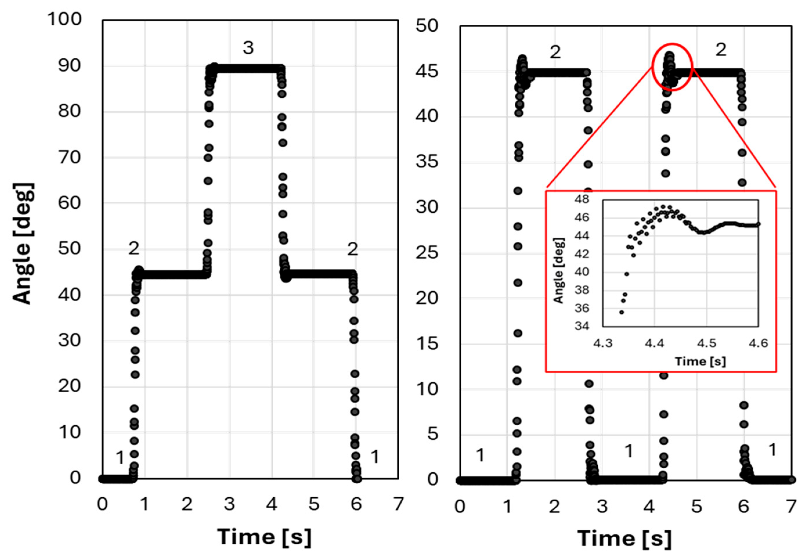 Figure 9 shows the rotor angle vs. time for a successful change between continuous stable positions of the actuator for both set ups, without payload (