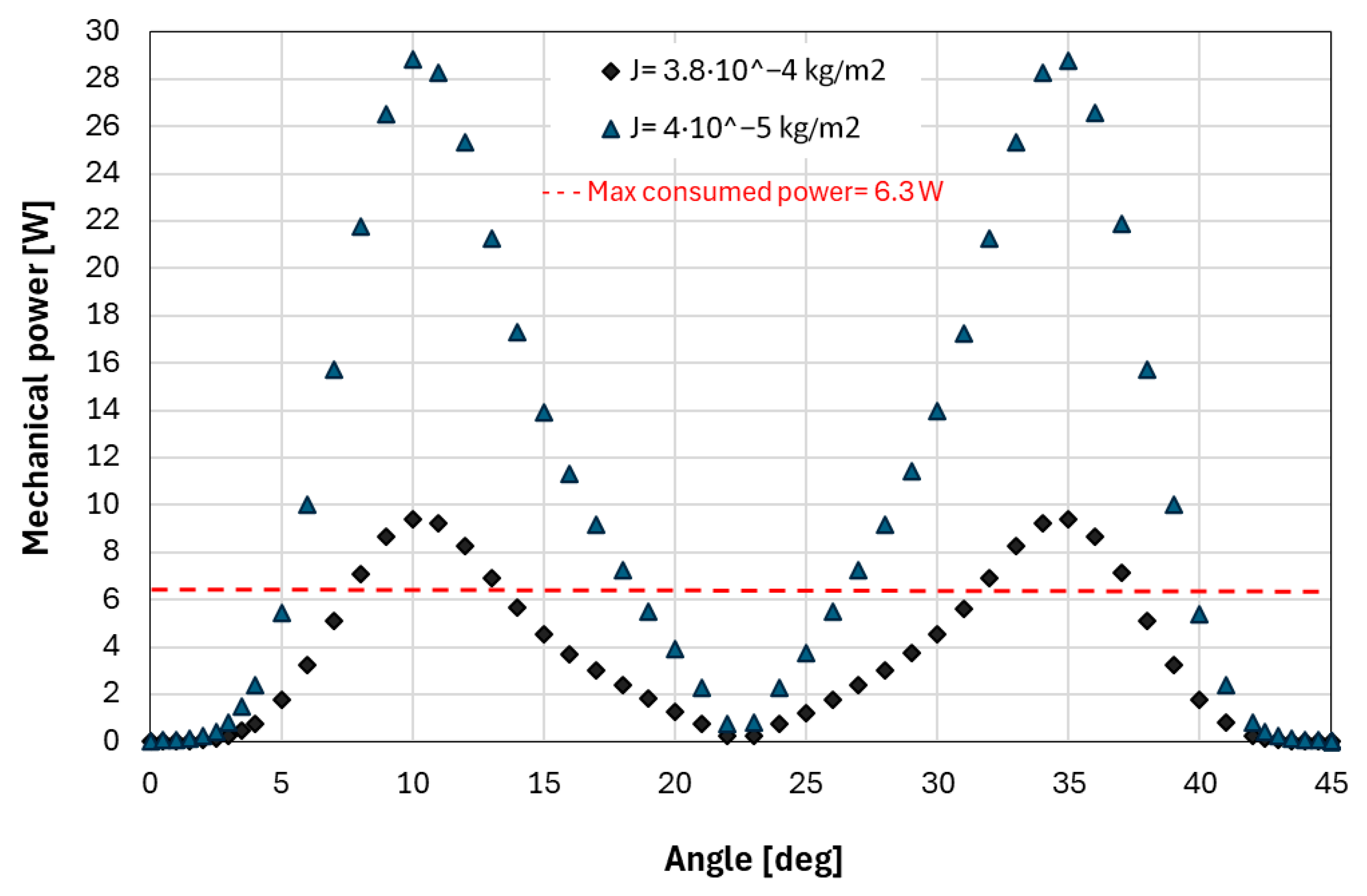 Figure 13 shows the equivalent actuator mechanical power vs. the angular position of the rotor and the experimental maximum power consumption of the potential actuator. From results in