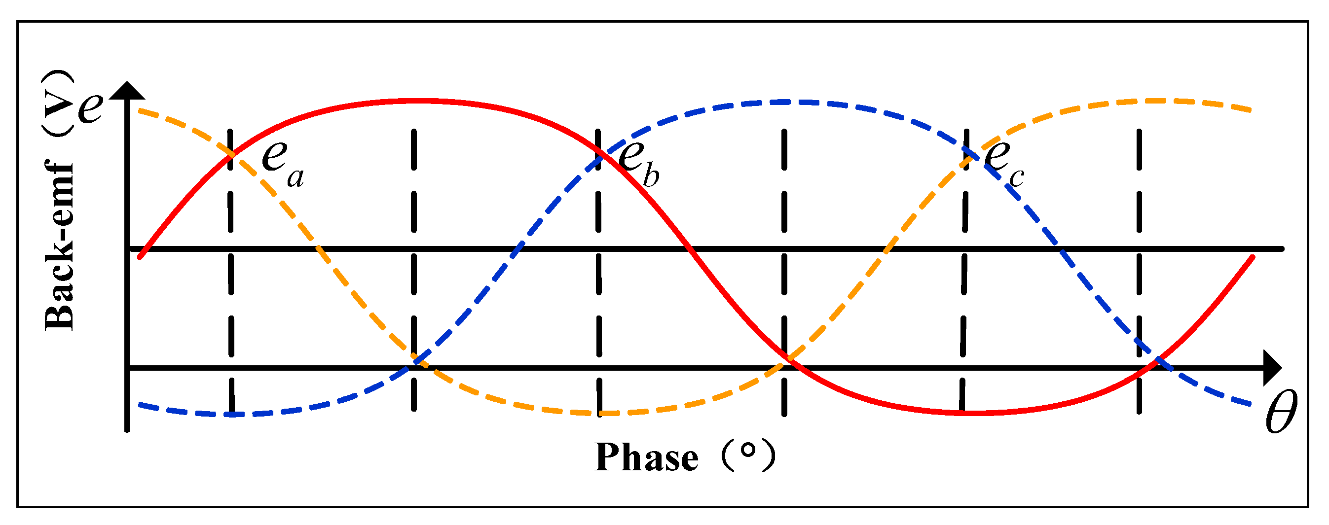 - The stator windings are assumed to be identical and symmetrically distributed with a spatial displacement of 120°. Under these assumptions and the equivalent circuit, the phase voltage model of the BLDC motor can be expressed aswhere , , represent the corresponding phase currents, and , , are the phase terminal voltages. Based on the principle of power conservation, the mechanical output power is equal to the electromagnetic input power . The electromagnetic power is expressed as the summation of the products of the back-EMFs and the corresponding phase currents [14]:Neglecting the mechanical losses of the system, including frictional resistance, the mechanical output power of the BLDC motor can be expressed, based on fundamental mechanics, as the product of the electromagnetic torque and the rotor speed, i.e., [15]where denotes the electromagnetic torque, and represents the mechanical angular velocity.