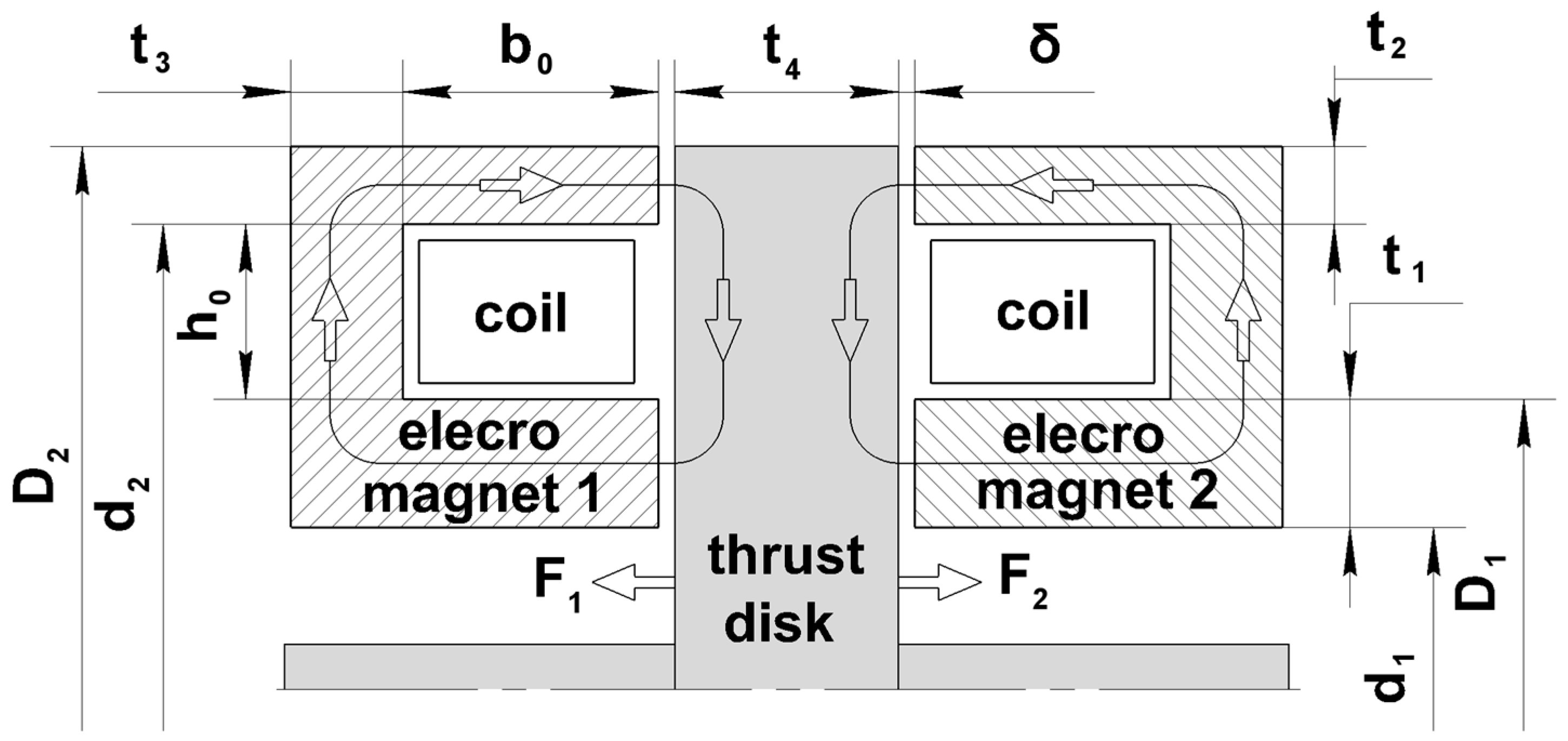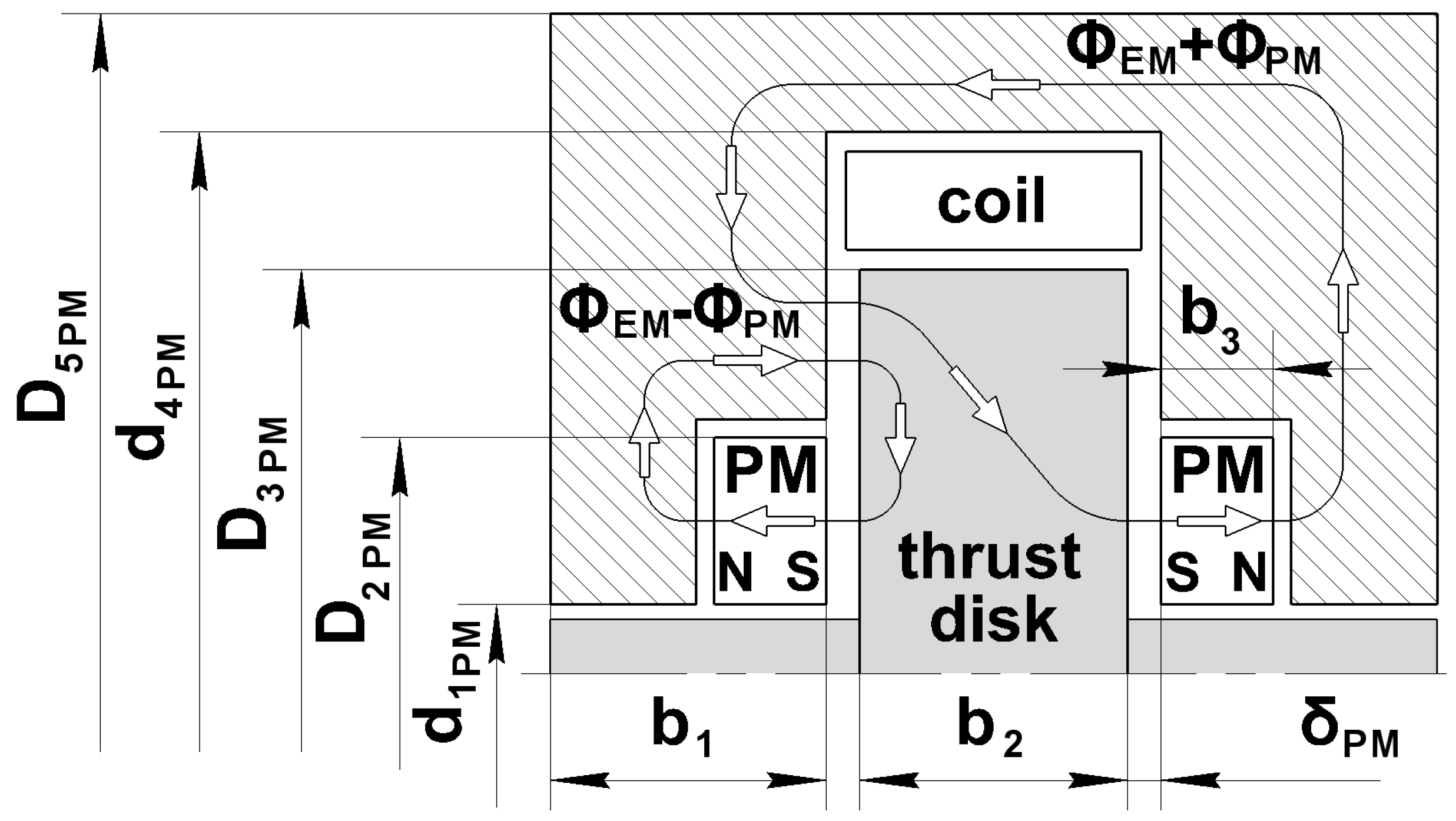 The hybrid AMB working principle is based on double-sided attraction forces acting on the thrust disk. When displacement of the ferromagnetic disk 2 is detected, the control system adjusts the current in the coil 5. This adjustment changes the magnetic attraction force, restoring the rotor to its equilibrium position. In the developed axial hybrid AMB, the bias magnetic flux is generated by PMs 6 and 7.