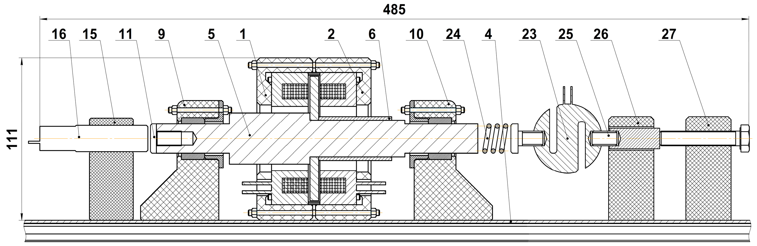 The mechanical system for applying external axial force consists of an S-shaped strain gauge 23 (DYLY-102S), to which a spring coupling 24 is attached. On the opposite side of sensor 23, coupling 25 is connected to transmit the axial force from the rod mounted in housing 26. The axial force on the rod is applied via a screw mounted in the housing 27, which is rotated by the handle 28.