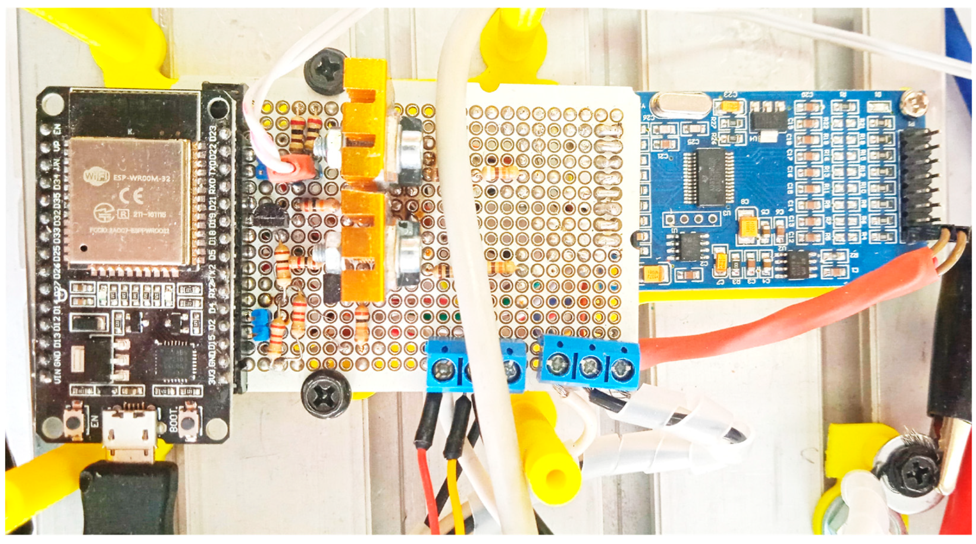 65]. The inductive displacement sensor ISAB A41A-43P-5-P is used. It requires conversion of the analog signal to digital using an external ADC (ADS1256). The ESP32 (with a PWM frequency of 240 MHz and a 10-bit clock speed) is used (