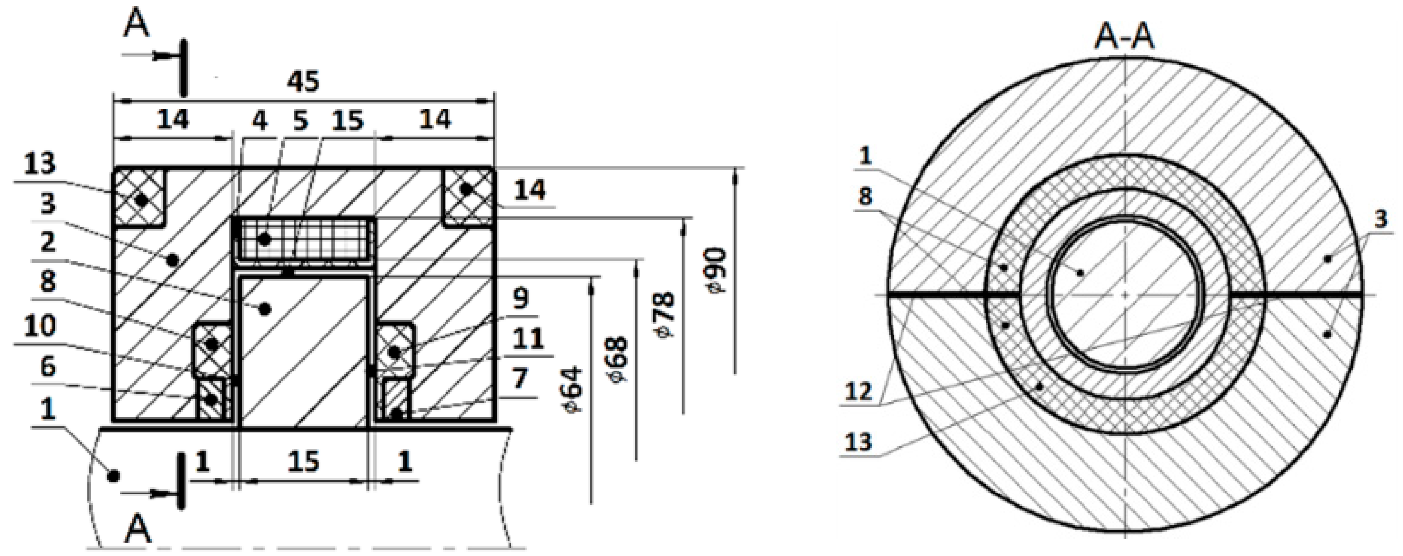 The magnetic conductors 3 are made of soft magnetic material 10880. The coil 4 is made of the diamagnetic, dielectric material polyamide-6. The permanent magnet holder 8 is made of stainless steel and was later replaced by holders made from diamagnetic, dielectric polyamide-6. Both the magnetic core 3 and the PM holders 8 and 9 are split into two radial segments, with the insulating pads 12 between them. These insulating pads reduce path contours to minimize the negative influence of eddy currents. The segmented magnetic core 3 is fixed by clamping rings 13 and 14, which are made of polyamide-6. The ferromagnetic disk 2 is secured by the hub 16 and the nut 17. The setup was designed, fabricated, and assembled (