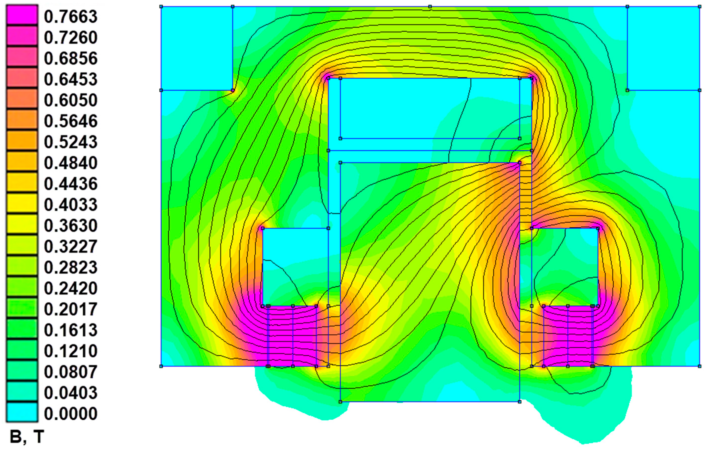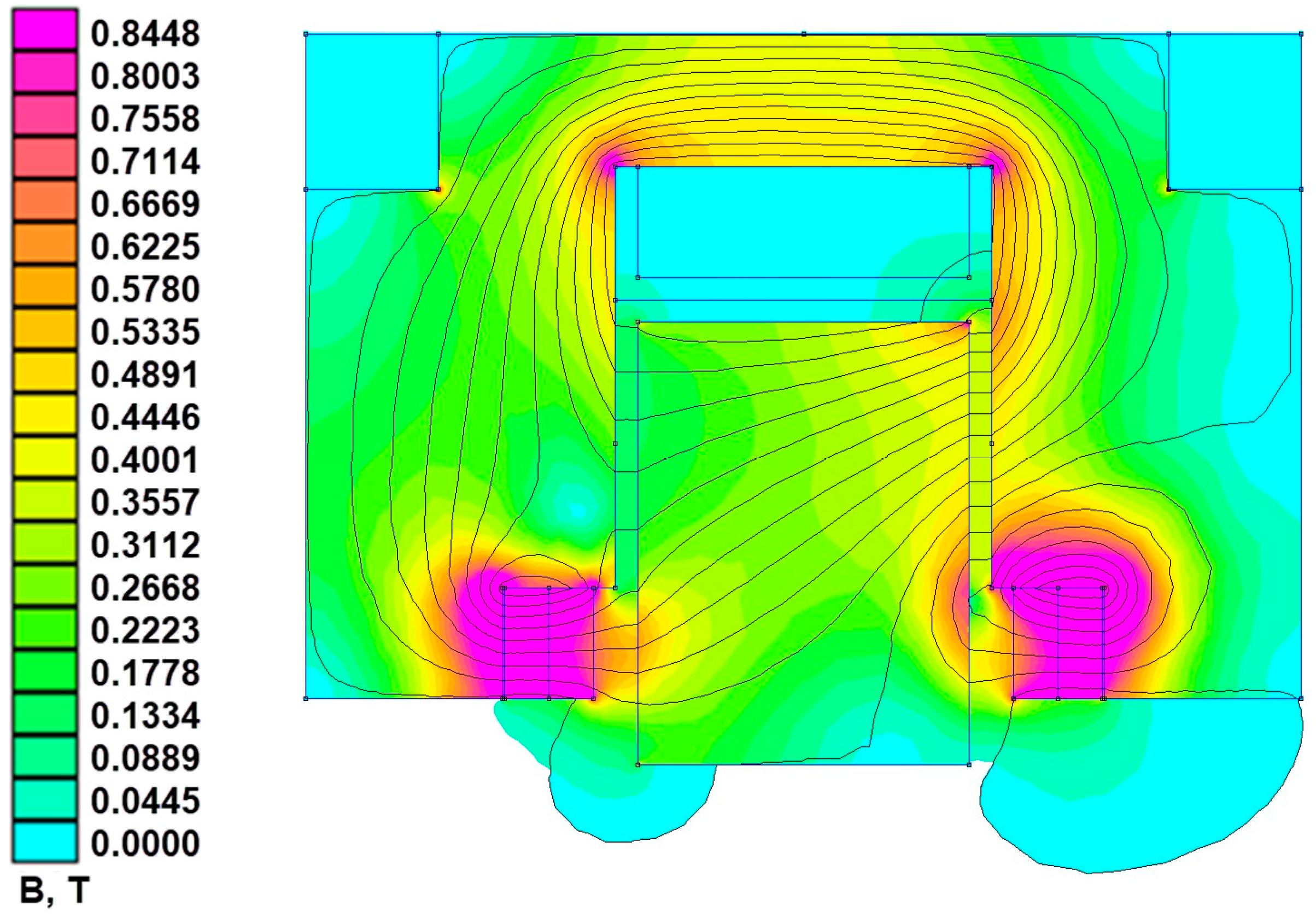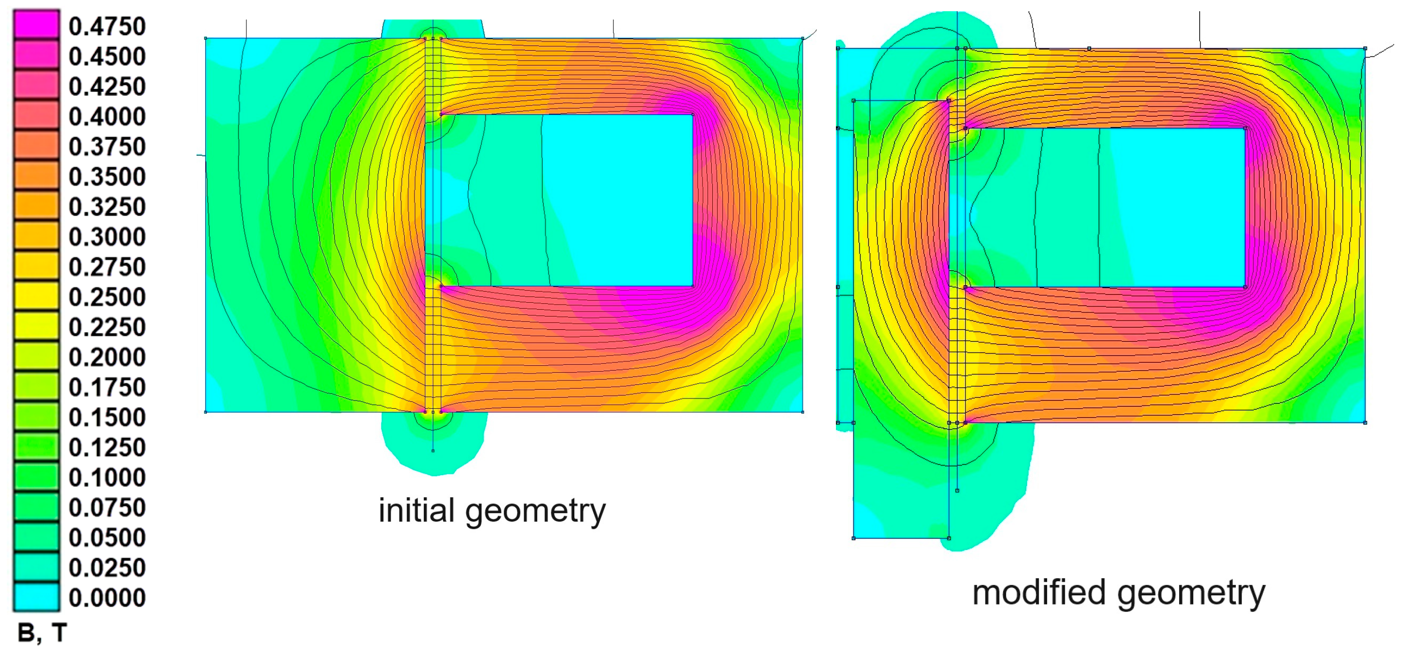 According to the numerical results for the initial geometry, obtained through analytical calculations, the load-carrying capacity at a current of 2.4 A (with power consumption of 17.87 W) is 71.8 N, with an air gap of 1 mm. The difference between the analytical and numerical results is less than 10%. The coil temperature reaches 143.9 °C (416.9 K), which is lower than the maximum permissible temperature of the insulation material (180 °C). The distribution of magnetic flux density in the AMB for the two geometry variants is shown in