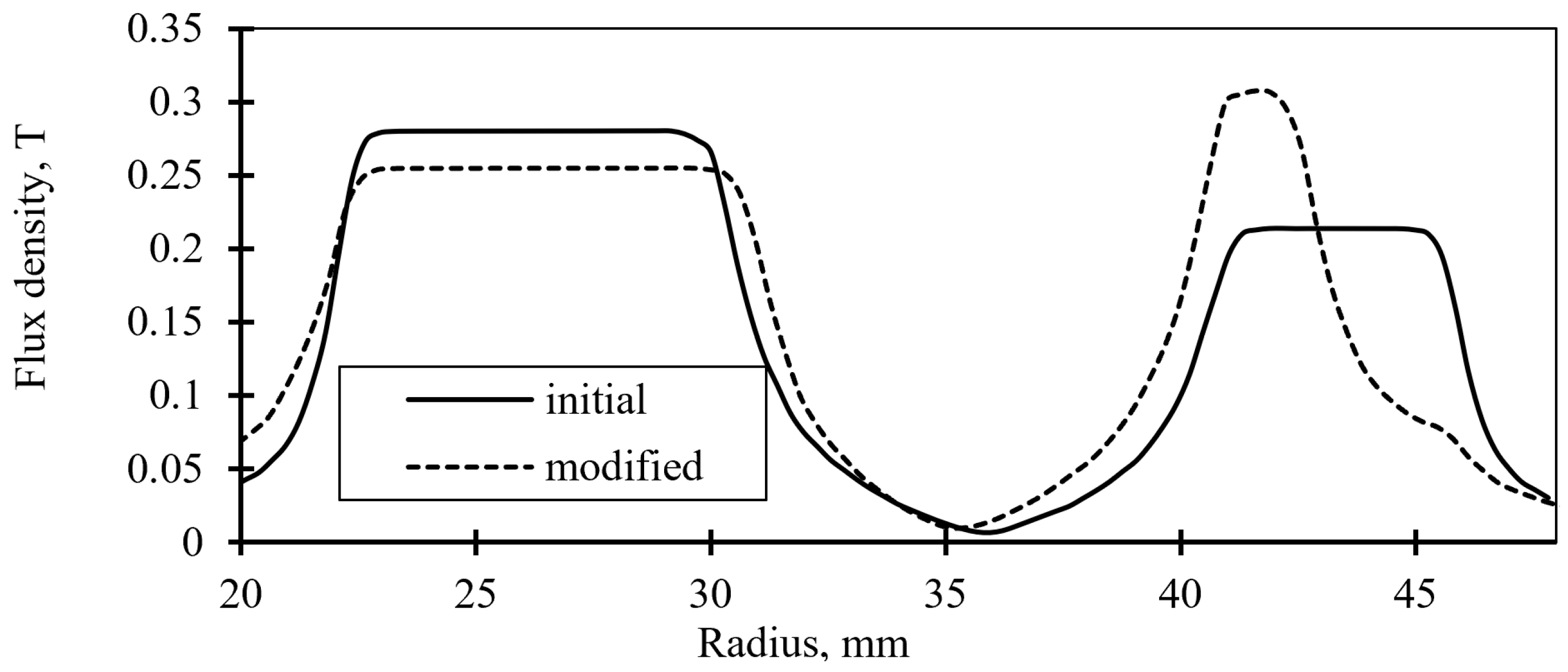 Figure 14 shows the distribution of magnetic flux density in the radial direction in the middle of the gap for both the initial and modified geometries. The flux density for the initial geometry is more evenly distributed.