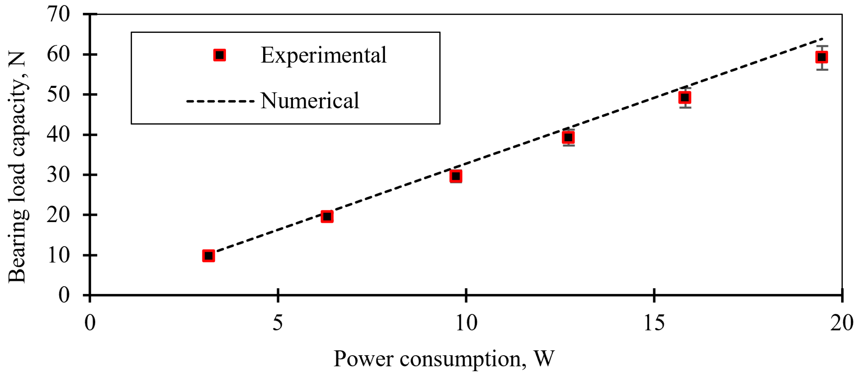 The experiment was conducted. The bearing load capacity dependence on power consumption is shown in