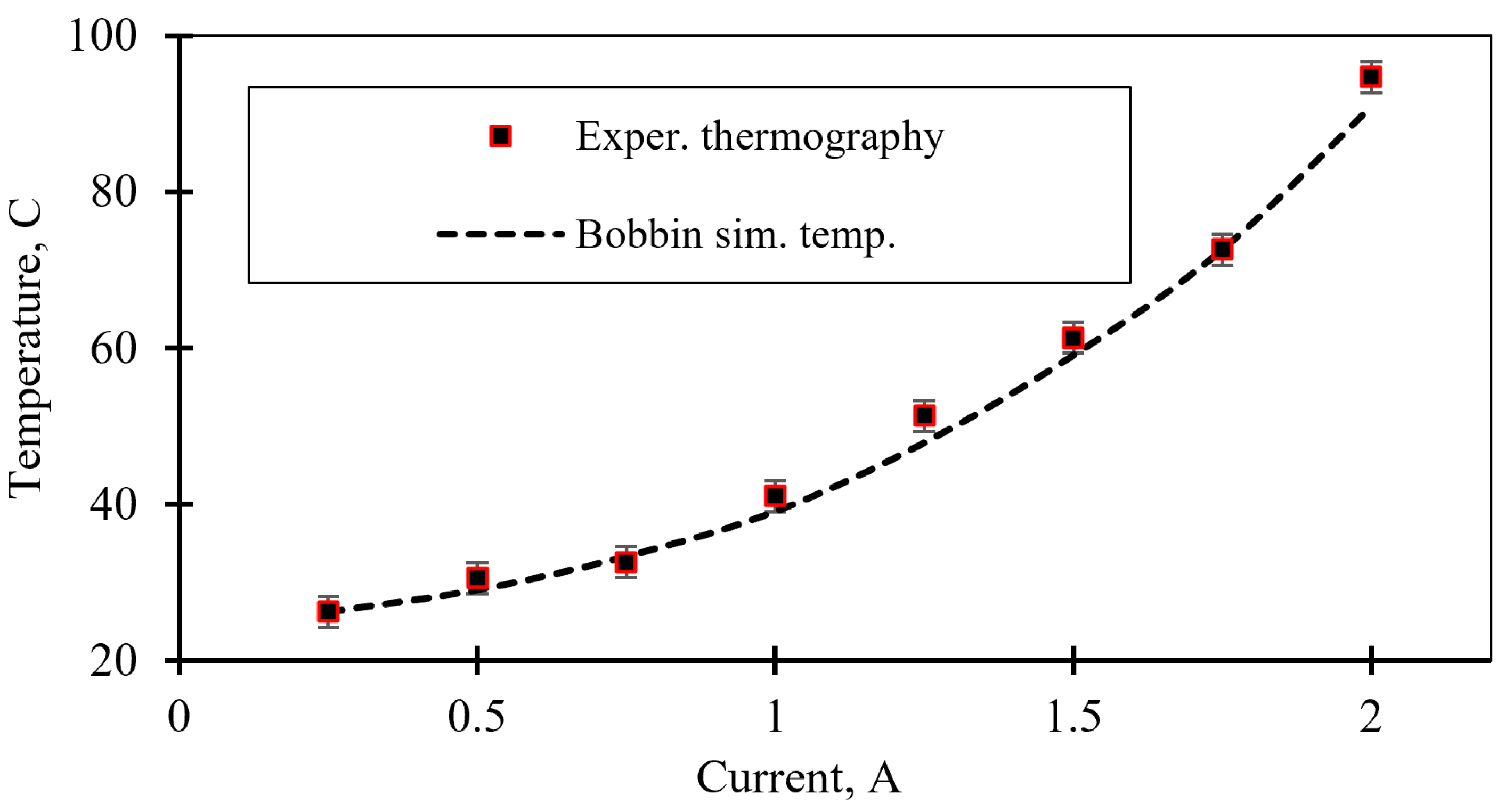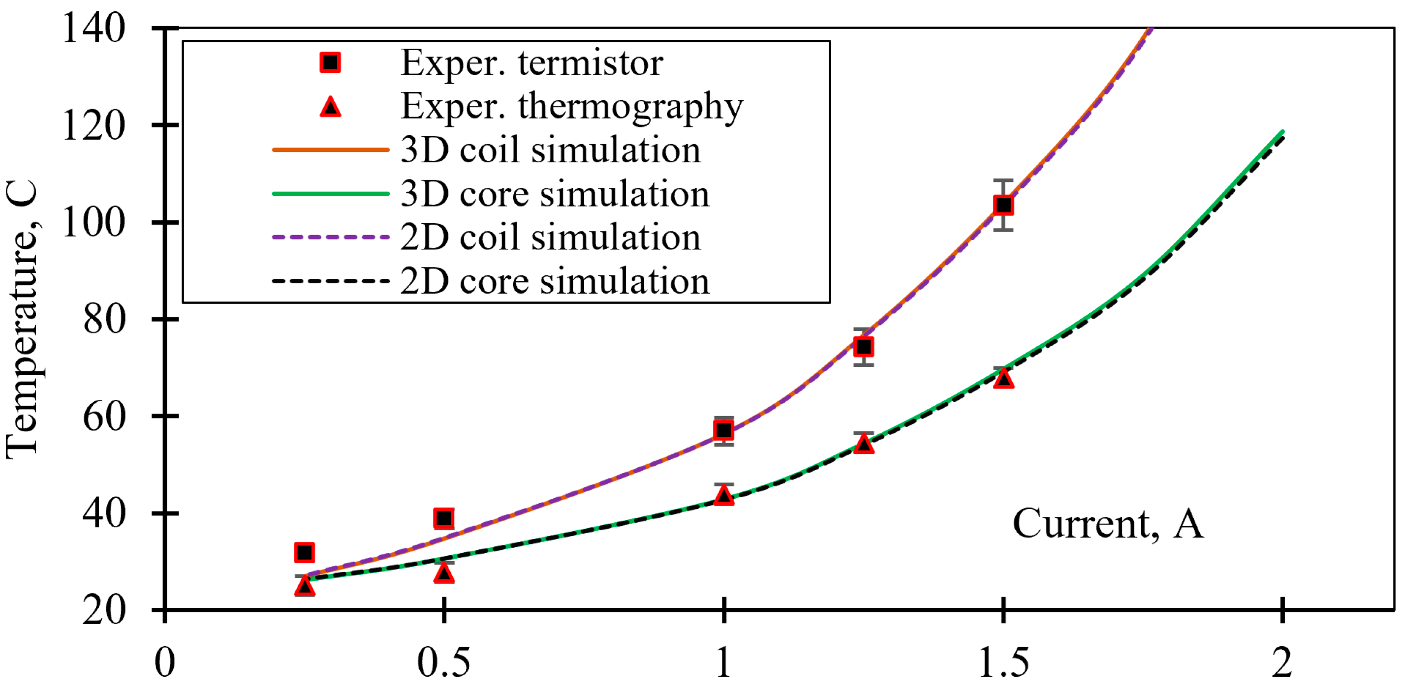 Figure 19) numerical models provided accurate results (the difference is less than 0.4%). The difference between the 3D model results and the experimental data did not exceed 3.3% for the coil temperature and 2.5% for the magnetic core at temperatures above 40 °C (