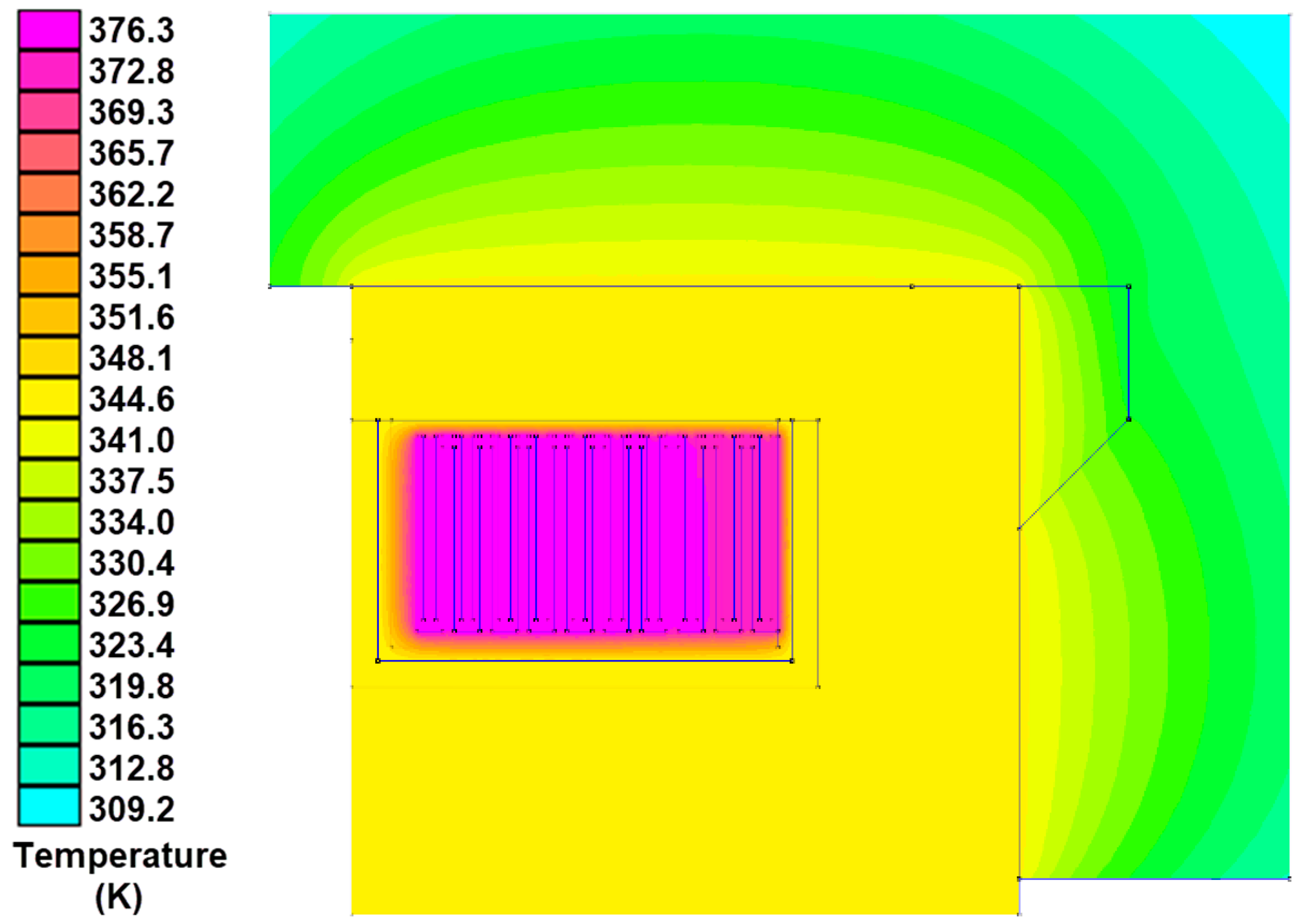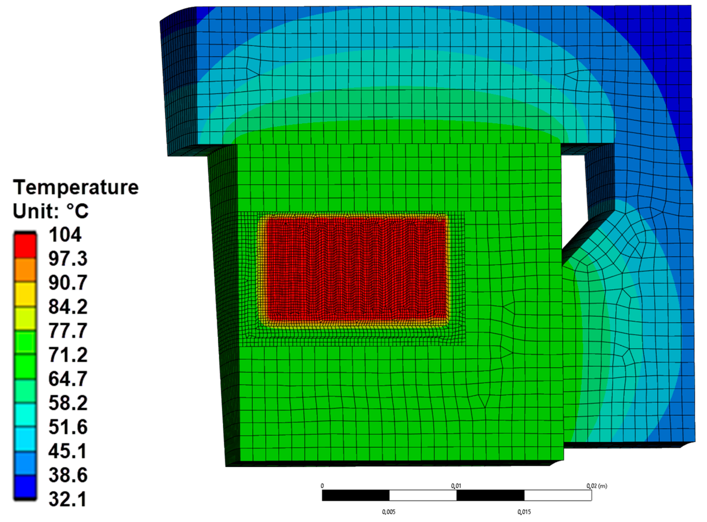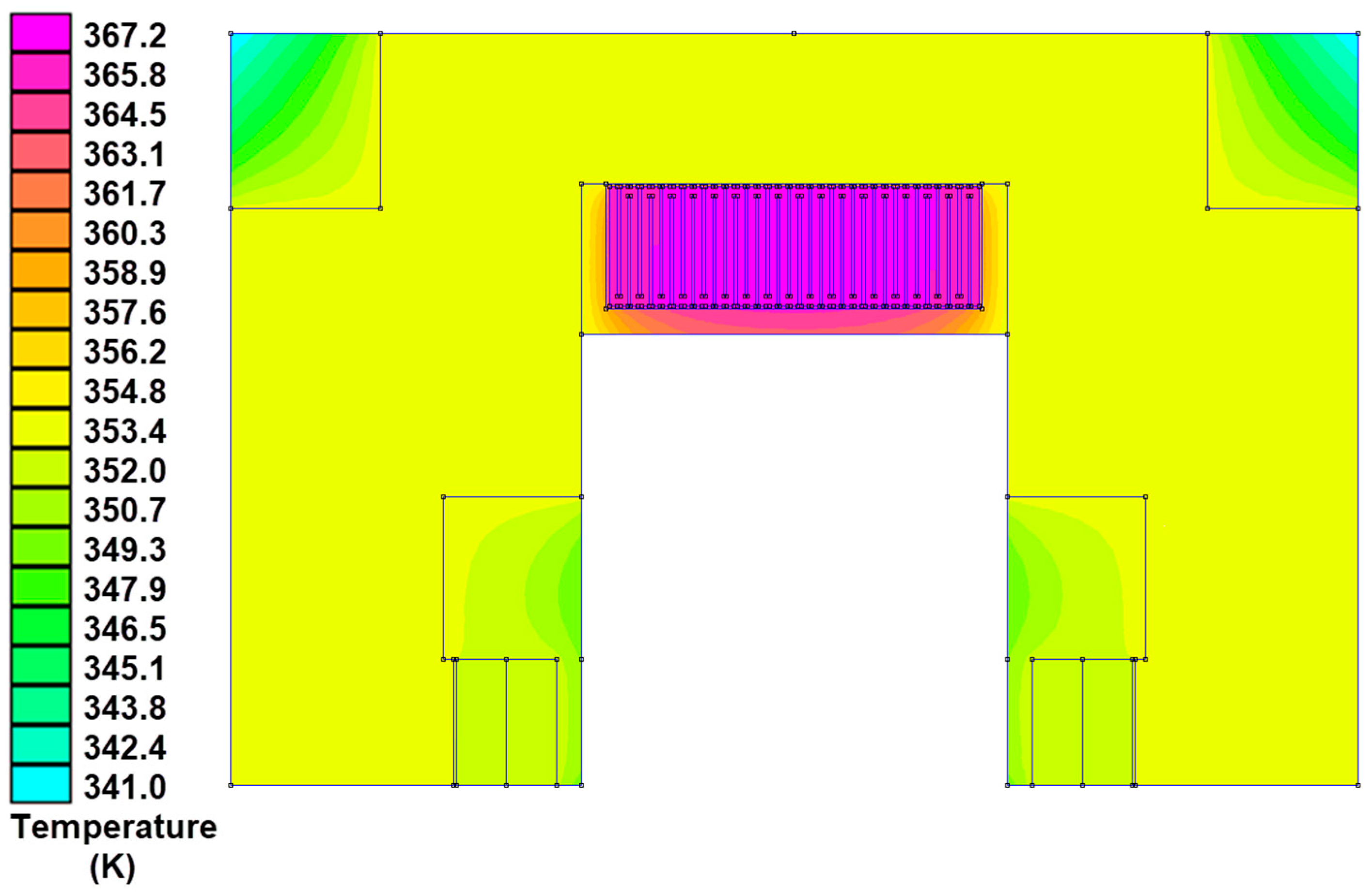 Figure 17). The emissivity coefficient was set to ε = 0.85, which corresponds to the rough surface of the magnetic material 10880. The surfaces were not coated, painted, or polished and had small oxidation marks, with an average roughness of Ra 6.3. The cold area between the electromagnet’s inner and outer poles corresponded to the aluminum bobbin, requiring a coefficient of about ε = 0.15.