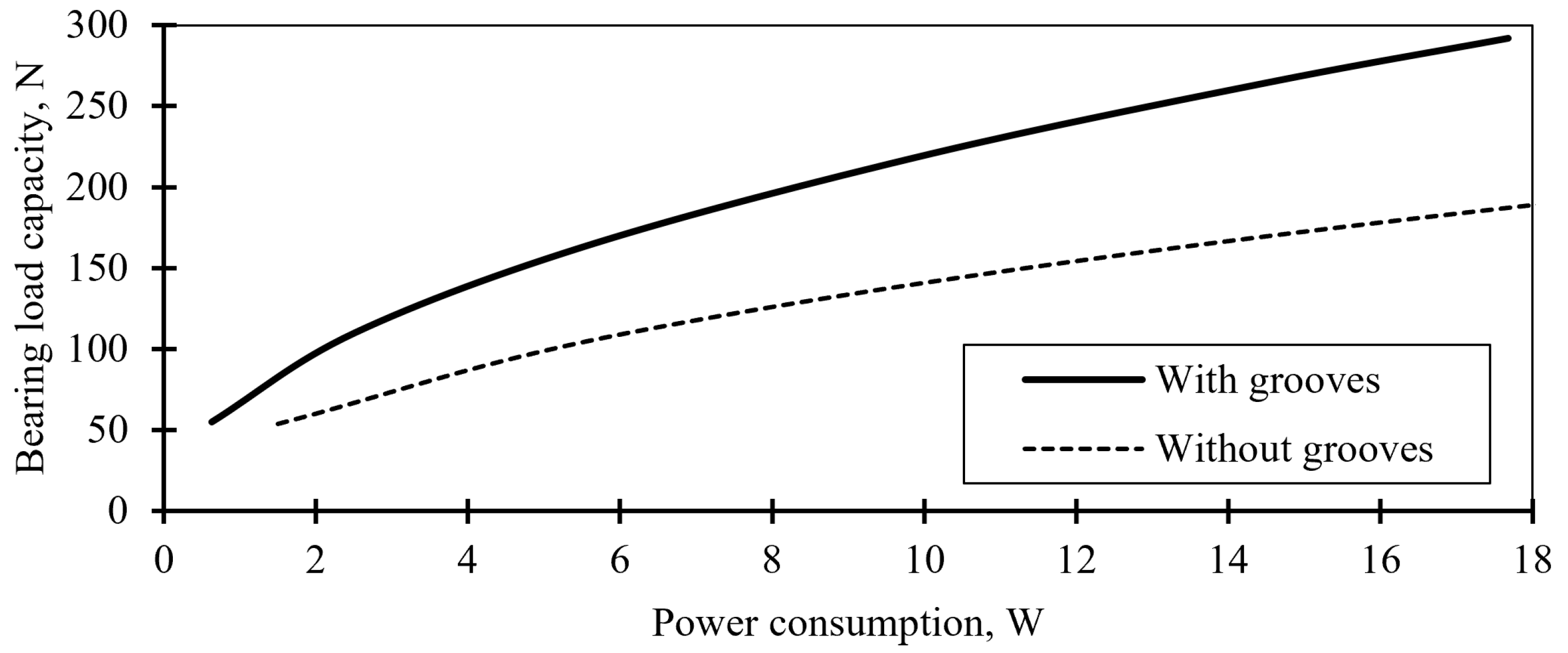 Figure 22 shows the load-carrying capacity dependence of the hybrid axial AMB on the required electrical power consumption for two different designs: with grooves and without. This dependence was calculated for an axial air gap of 0.5 mm between the thrust disc and the magnetic core, a typical value for axial AMB systems with a similar outer diameter.