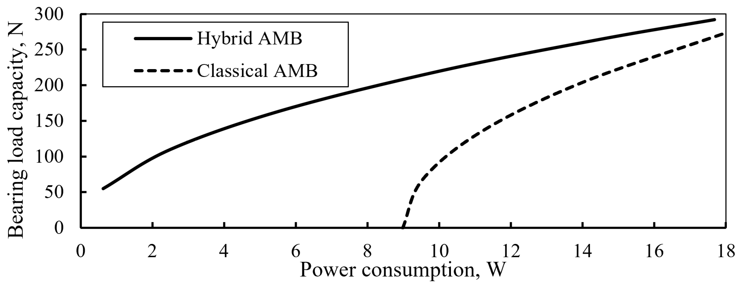 Figure 24 show a comparison of the load capacity dependence on electrical power consumption for both hybrid and classical AMBs, with an axial air gap of 0.5 mm and 1 mm, respectively. The initial geometric parameters of the classical AMB (