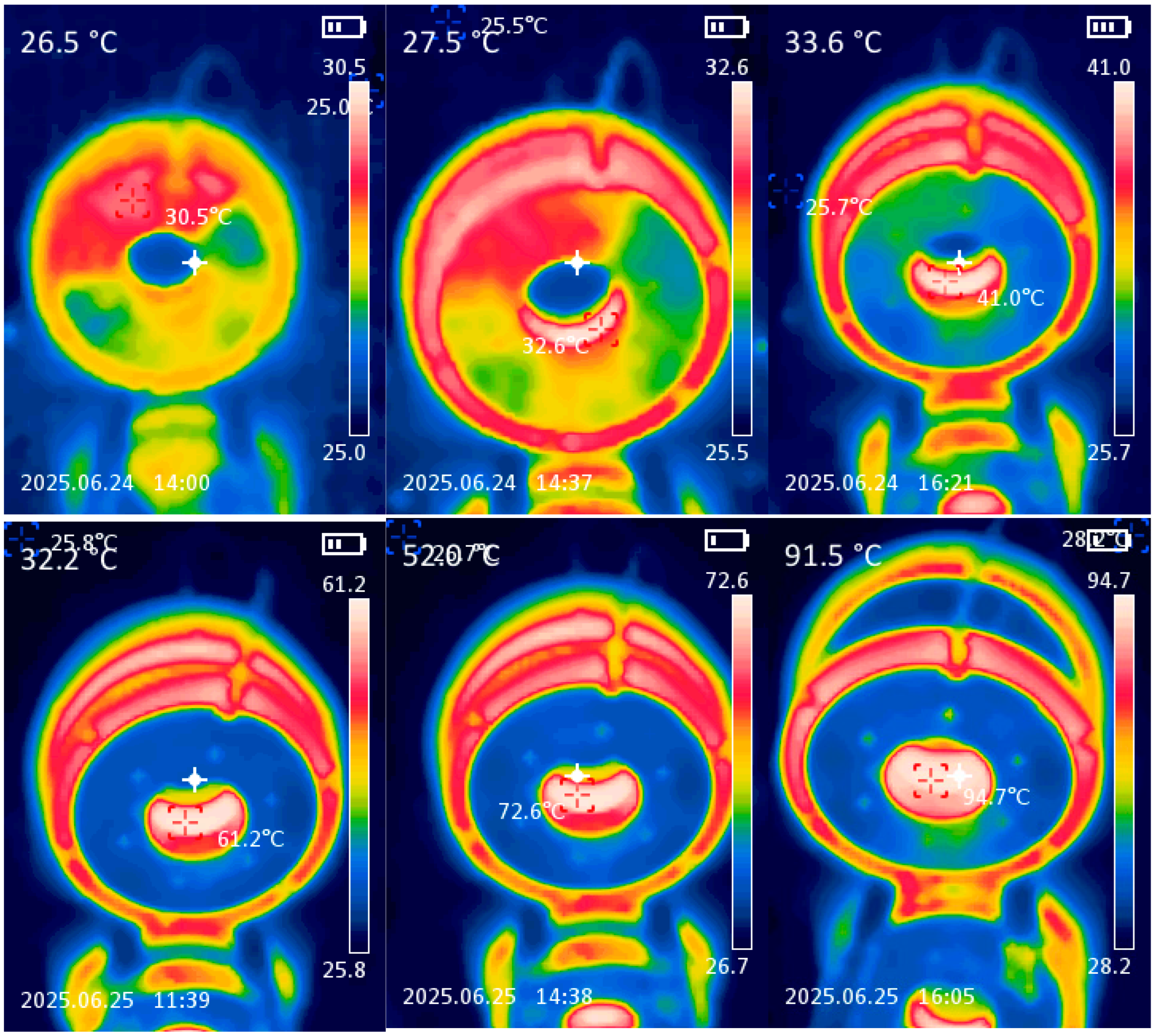 According to thermal analysis, the coil temperature of the PM-biased bearing does not exceed 94.8 °C, whereas the classical AMB’s coil temperature reaches 198.3 °C under the same load-carrying capacity. The permanent magnet temperature remains below 80.18 °C, which is lower than the maximum permissible temperature for the N38H alloy (120 °C). Finite-element axisymmetric models of both classical and hybrid axial AMBs provide accurate temperature distributions. The discrepancy between numerical and experimental results did not exceed 6.8%.
