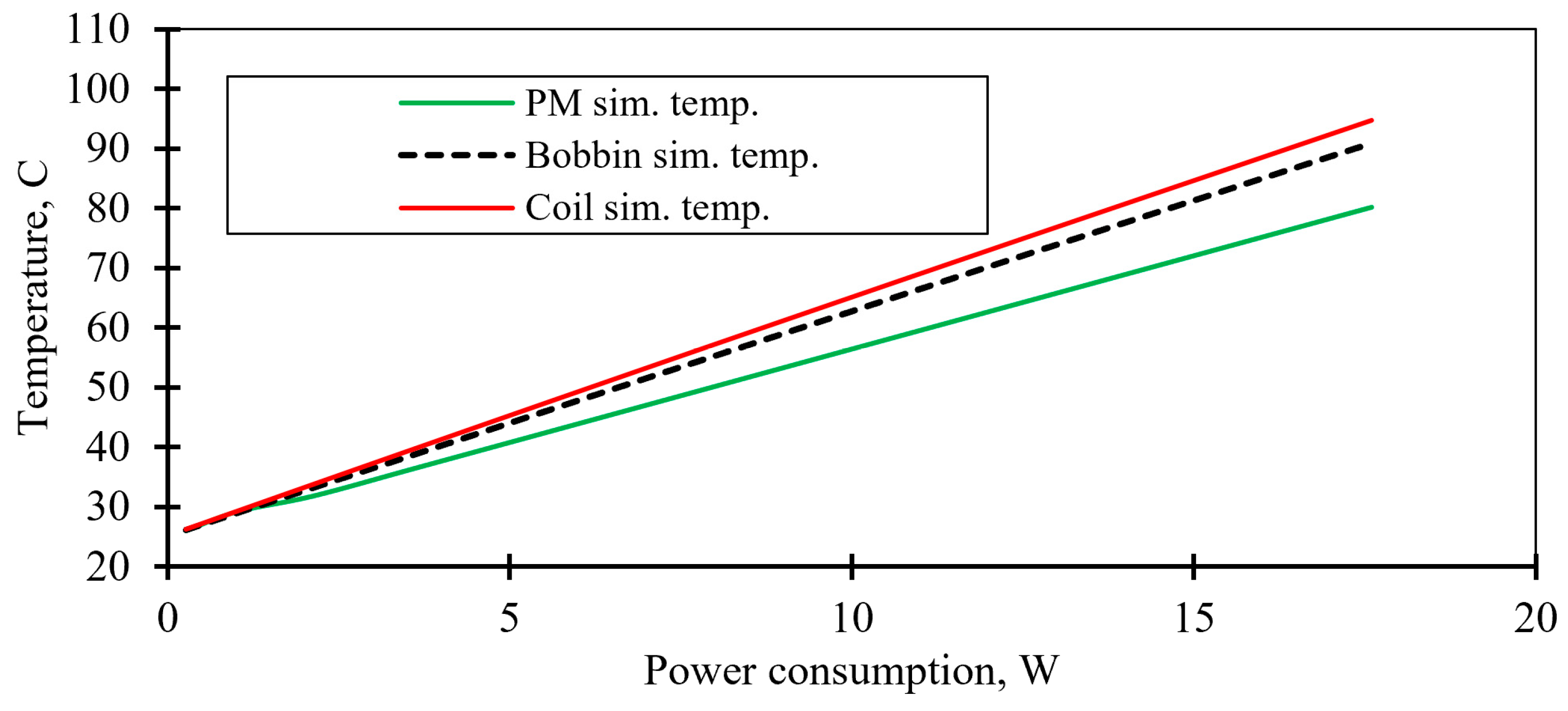 A 2D thermal model was used to determine the temperature distribution in the AMB. Equivalent coil modeling was used, with a similar volume and external surface area of the wire. The bobbin, PM, and coil temperature dependencies on the power consumption have been determined (