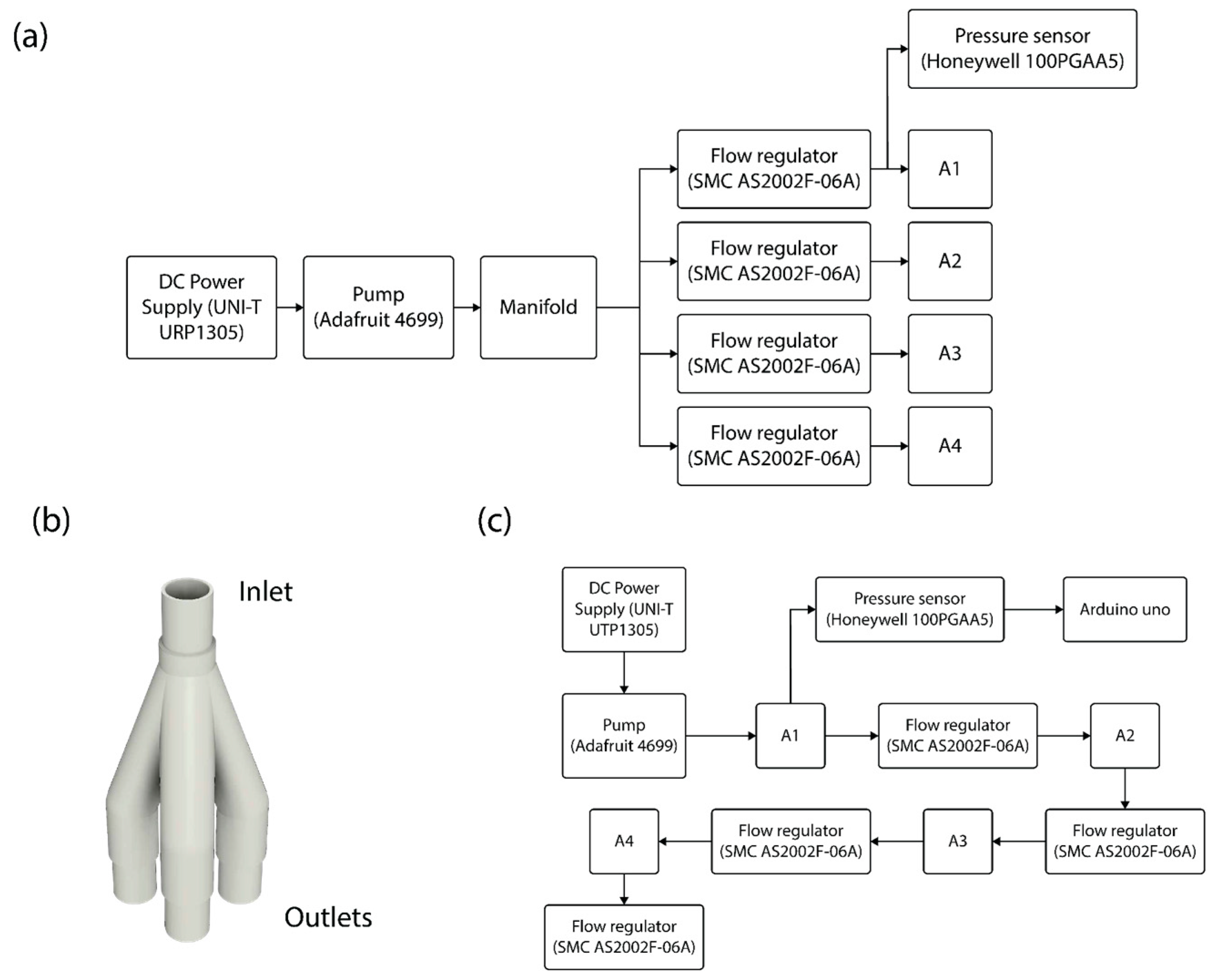 - Mechanical Flow Control: Fine-tuning of the stagnation pressure is performed using manual in-line speed controllers (SMC AS2002F-06A). These variable throttle valves are adjusted manually to restrict the flow rate downstream of the pump. By altering the valve opening, hydraulic resistance is modified to achieve the precise target pressure required for each test case.
