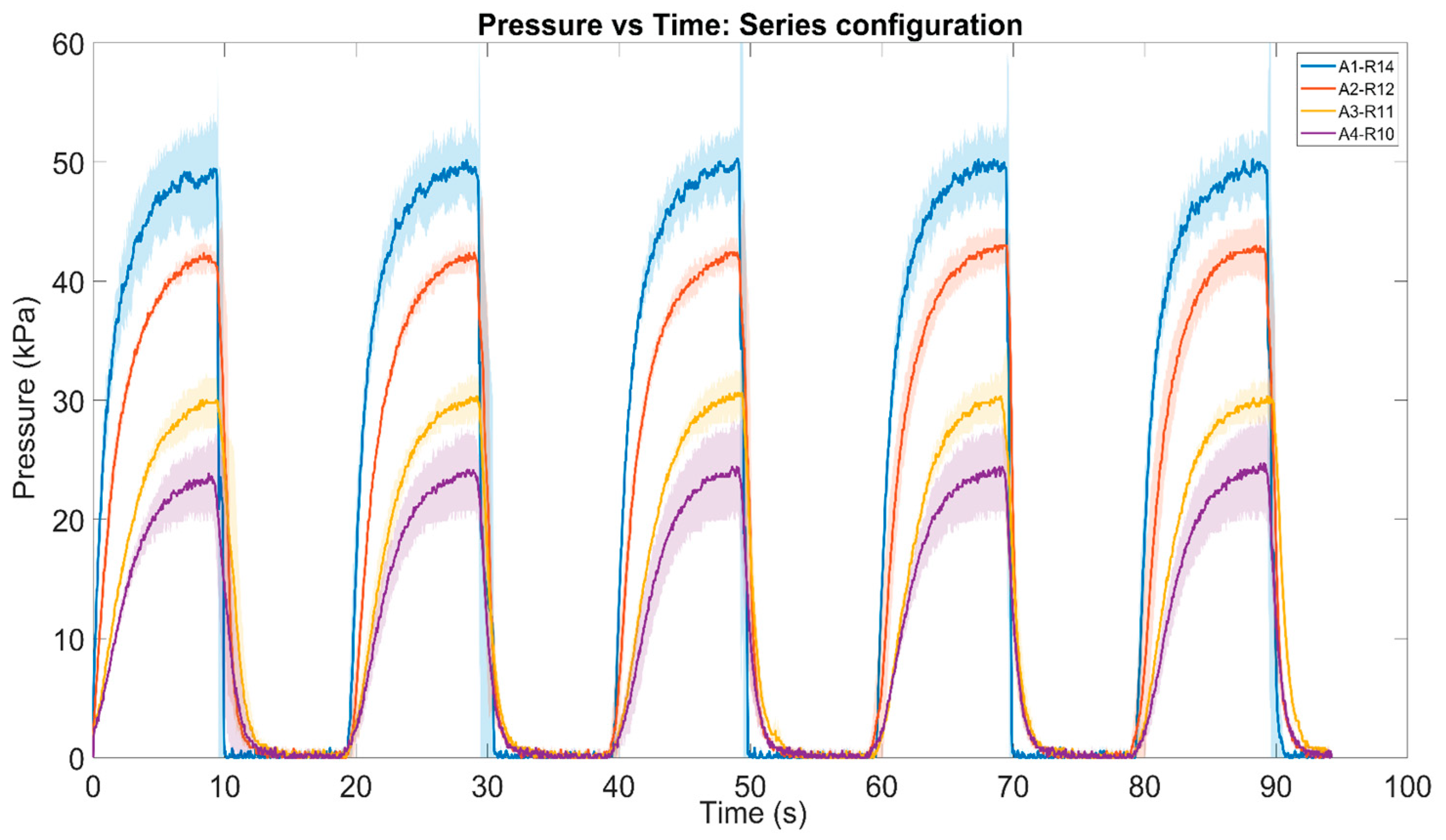 - Electrical Regulation: A programmable DC power supply is utilized to set limits on the pump’s input voltage (V). The DC power supply voltage was set to 2.0 V and is a step function with two states, 0 V and 2 V. This acts as a coarse control mechanism to establish the baseline hydraulic power and ensure the system operates within safe pressure limits.