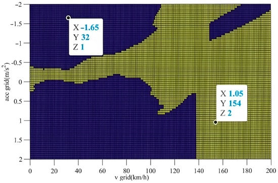 A hierarchical optimization method is proposed to simplify the optimization problem and decouple the two control variables. The first step is to determine the optimal gear offline. Firstly, vehicle speed and acceleration are discretized over typical operating ranges (, −2~2 m/s2). To minimize motor consumption, the optimal gear is selected using the following equations with the lowest motor power consumption, resulting in a gear selection map in Figure 3.