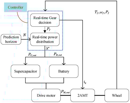 The real-time control process is illustrated in Figure 4. First, sensors collect current vehicle speed; the controller uses the current vehicle speed and a predefined prediction horizon to generate predicted speed and acceleration profiles. Subsequently, the optimal gear is determined in real time via a look-up table, and the optimal total demand power over the prediction horizon can be calculated. The required power is then discretized according to the sampling time () and segregated into driving and braking components. The optimal equivalence factor is derived analytically to assign output power setpoints for the battery and supercapacitor. If any power value exceeds operational limits, the Hamiltonian is penalized to infinity (), forcing the corresponding source to operate at its boundary.