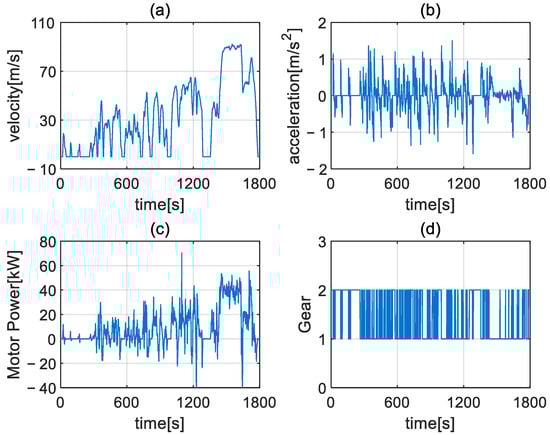 Driving cycle of CLTC_C: (a) vehicle speed; (b) vehicle acceleration; (c) drive motor power; (d) selected gear of 2AMT.
